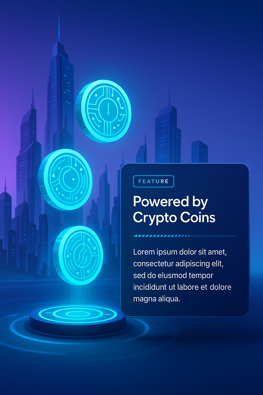 A vibrant futuristic city skyline featuring glowing crypto coins. The design incorporates a dynamic 3D illustration with a sleek information block.