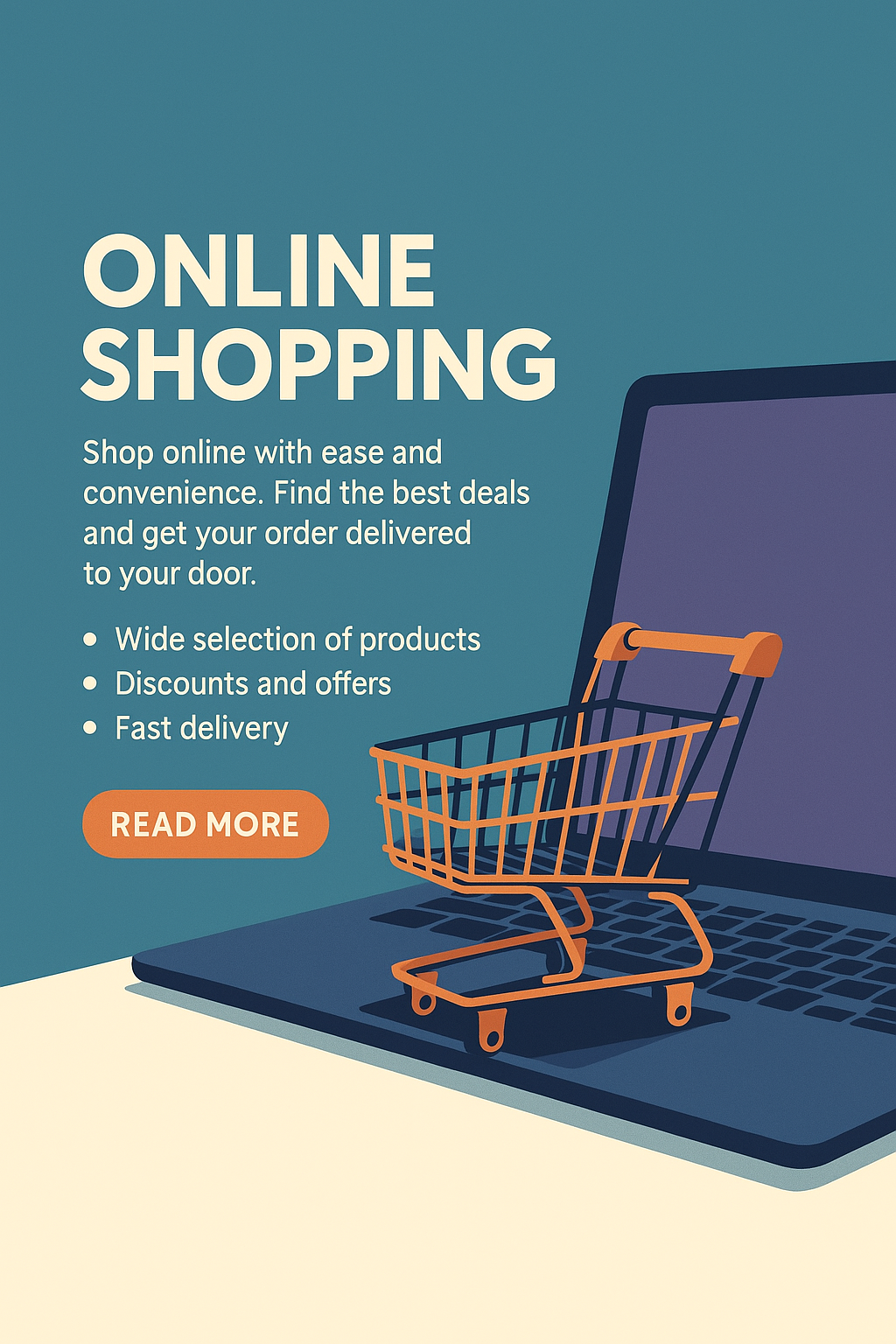 Stylish promotional graphic emphasizing the benefits of online shopping, featuring a laptop and shopping cart illustration. Ideal for e-commerce marketing.