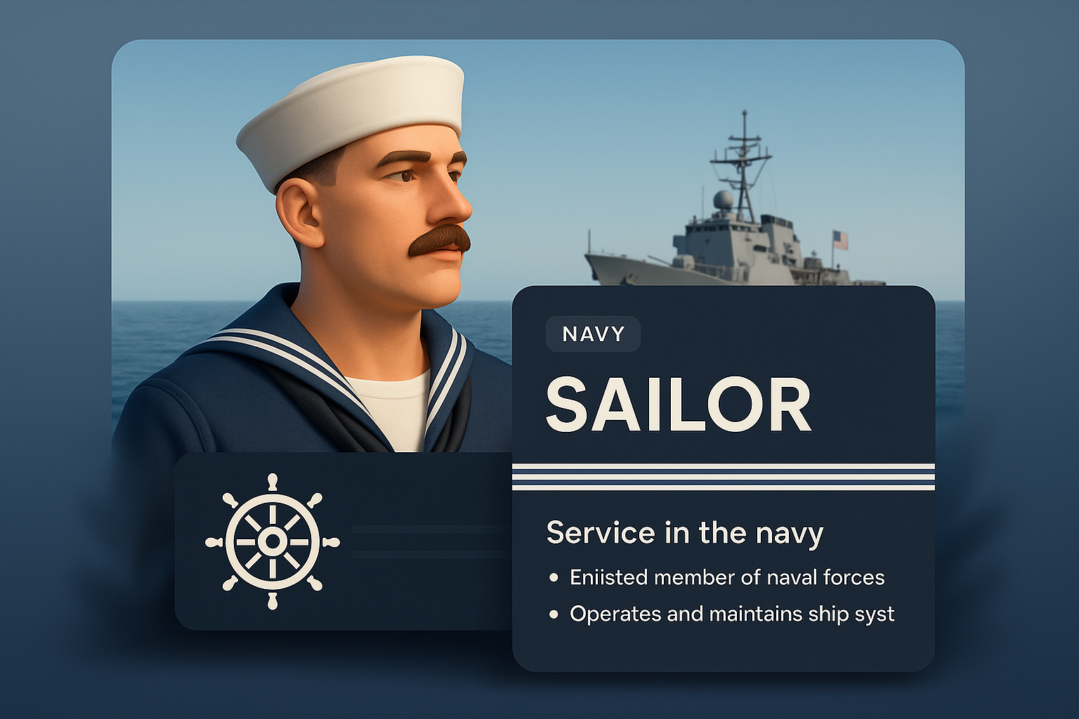 A detailed 3D illustration of a sailor in navy attire, set against a smooth gradient background. The design features integrated text blocks highlighting naval service.