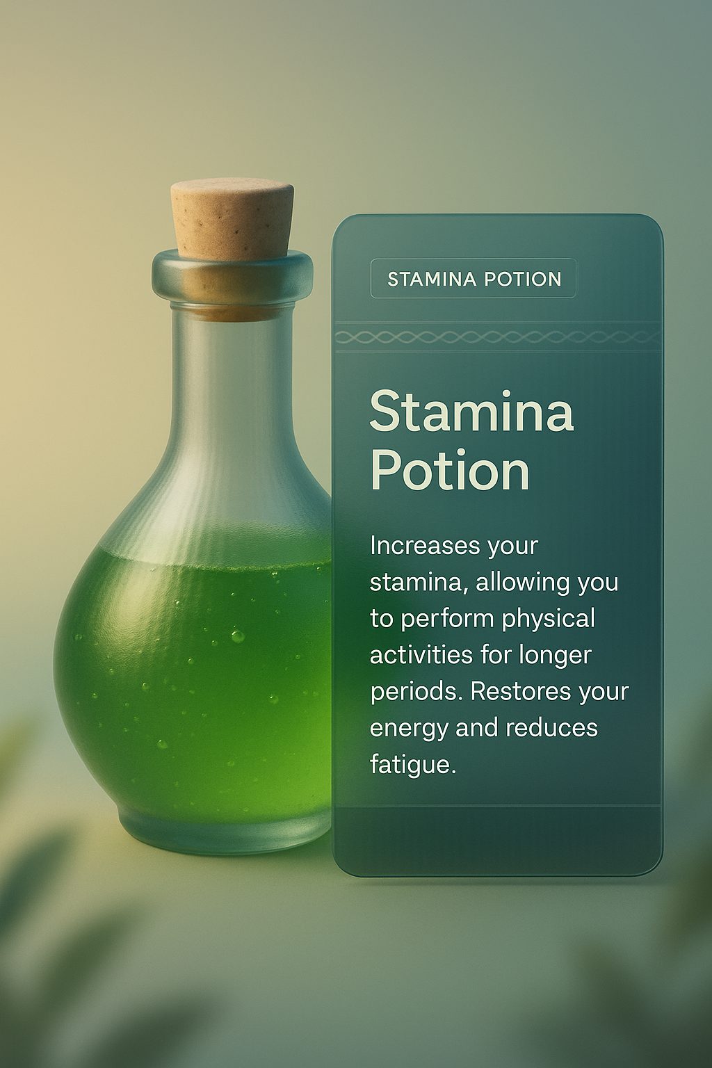 /Collection: /by davooda/Type: PNG/A visually appealing 3D illustration of a stamina potion in a glass bottle, accompanied by an integrated design block featuring a title and description. The background transitions softly, enhancing the potion's vibrant color.