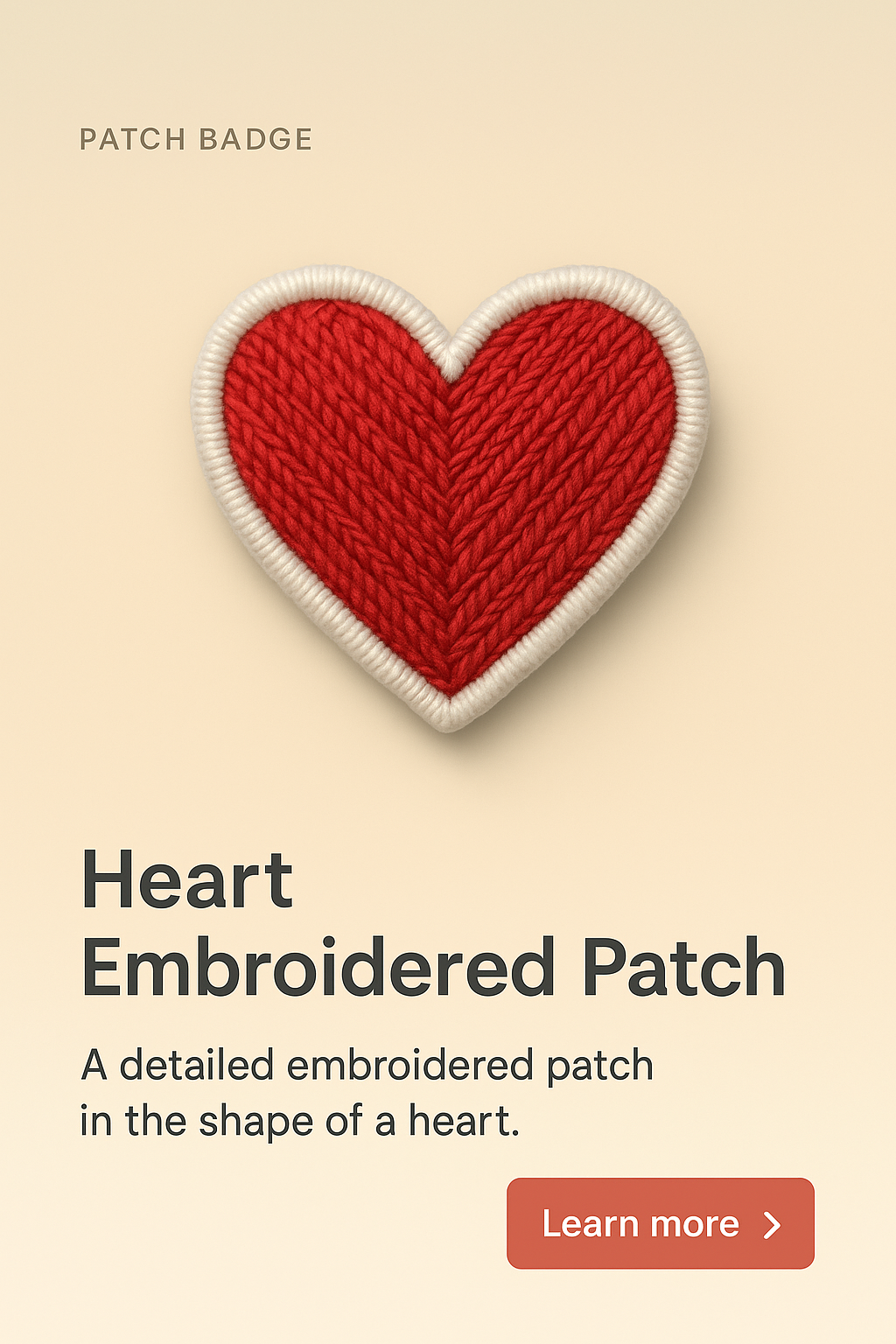 A detailed 3D illustration of a heart-shaped embroidered patch on a smooth gradient background, featuring a clear title and learn more button.