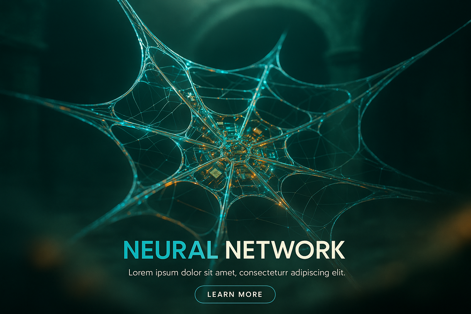 /Collection: /by davooda/Type: PNG/An intricate glowing web representing a neural network, crafted from glass-like polymers and illuminated by micro-LEDs. The scene features a blurred background and foreground, enhancing depth with neon accents and metallic reflections.