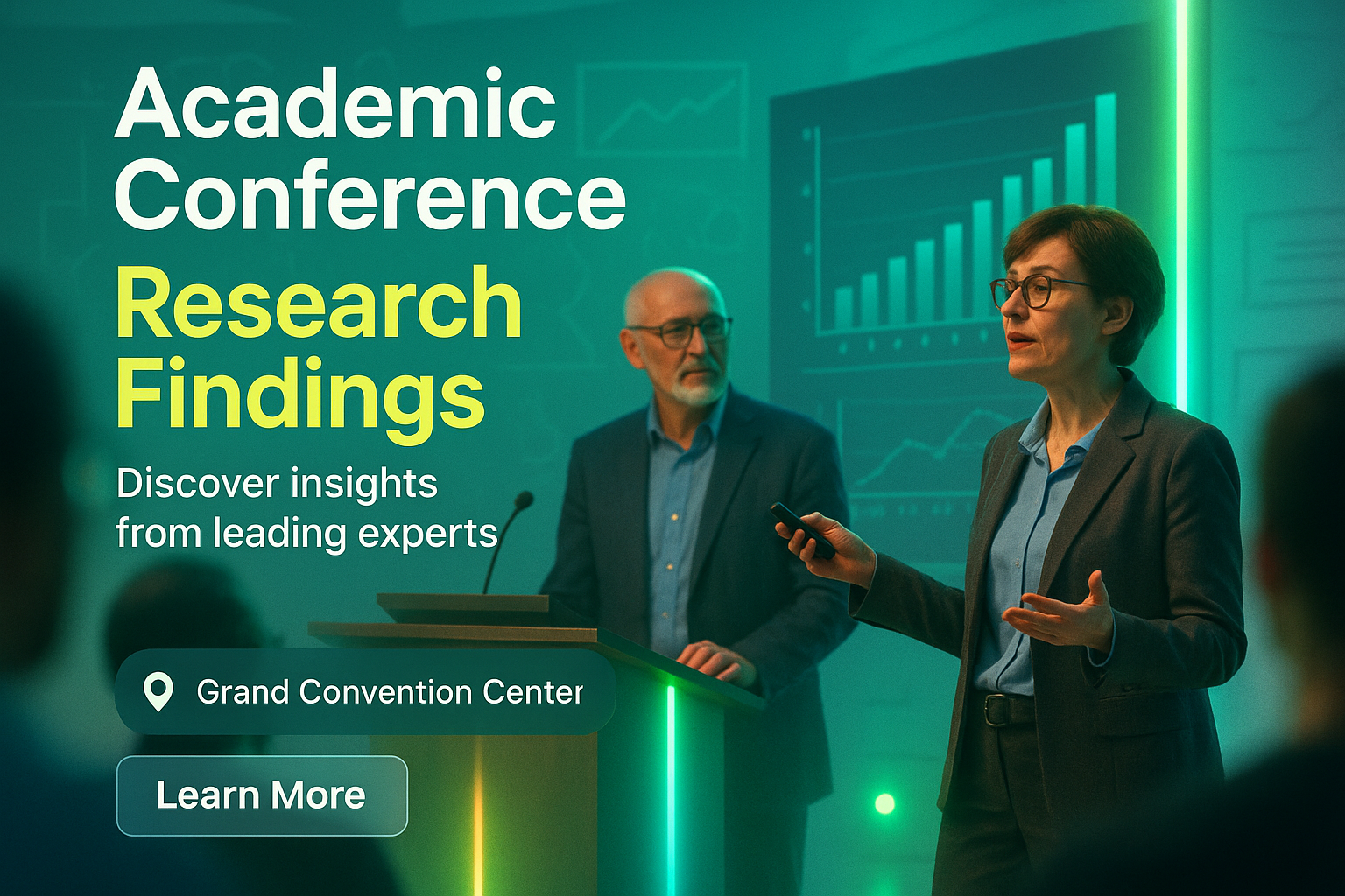 /Collection: /by davooda/Type: PNG/Dynamic image showcasing a conference setting with speakers presenting research findings. The modern design features vibrant colors and professional elements, suitable for event promotion.