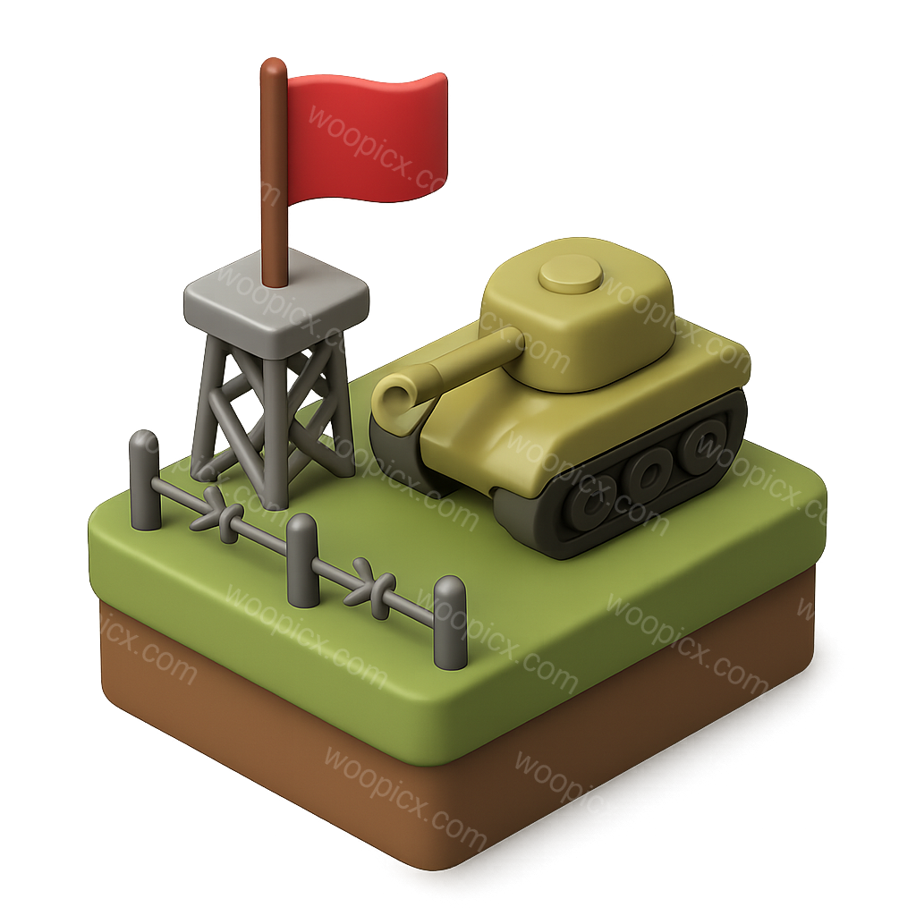 A stylized isometric icon featuring a tank, a watchtower, and a flag on a grassy terrain, showcasing a military theme in a vibrant 3D design.