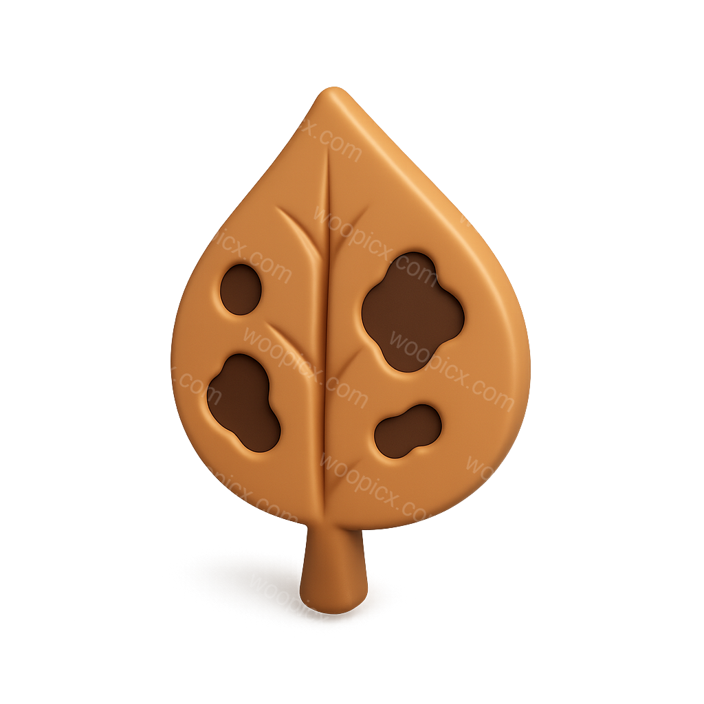 /Premium/Collection: /by davooda/Type: PNG/A three-dimensional, stylized leaf icon representing blight, featuring a smooth, glossy texture and a warm orange color. The leaf has distinct holes and a raised vein pattern, giving it a volumetric and isometric appearance.