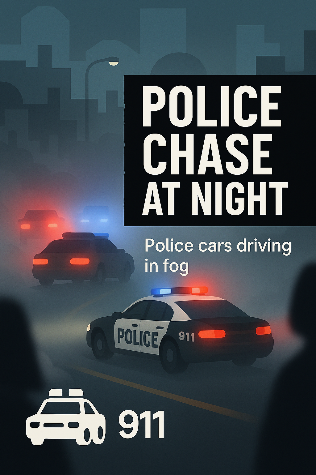 A moody illustration depicting a police chase at night, showcasing police cars with flashing lights in a foggy urban environment. Ideal for crime-themed media.