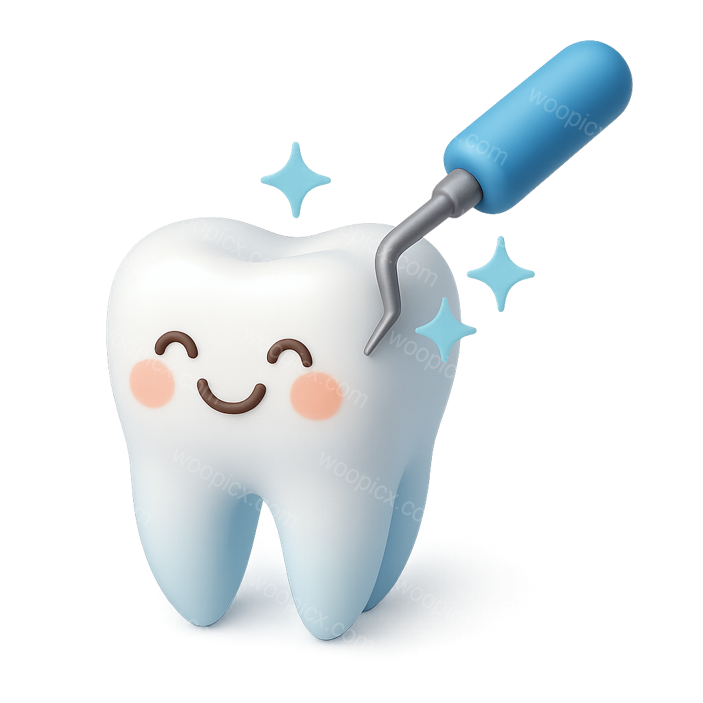 A cheerful 3D dental icon featuring a smiling tooth with rosy cheeks, complemented by a dental cleaning tool. The design showcases a transparent background and an isometric view, enhancing its 3D appeal.