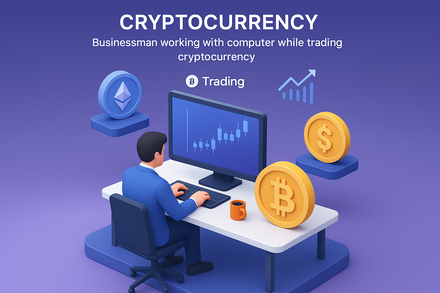 /Collection: /by davooda/Type: PNG/3D digital illustration depicting a businessman trading cryptocurrency on a computer, featuring icons for Bitcoin, Ethereum, and financial graphs. Ideal for fintech and trading platforms.