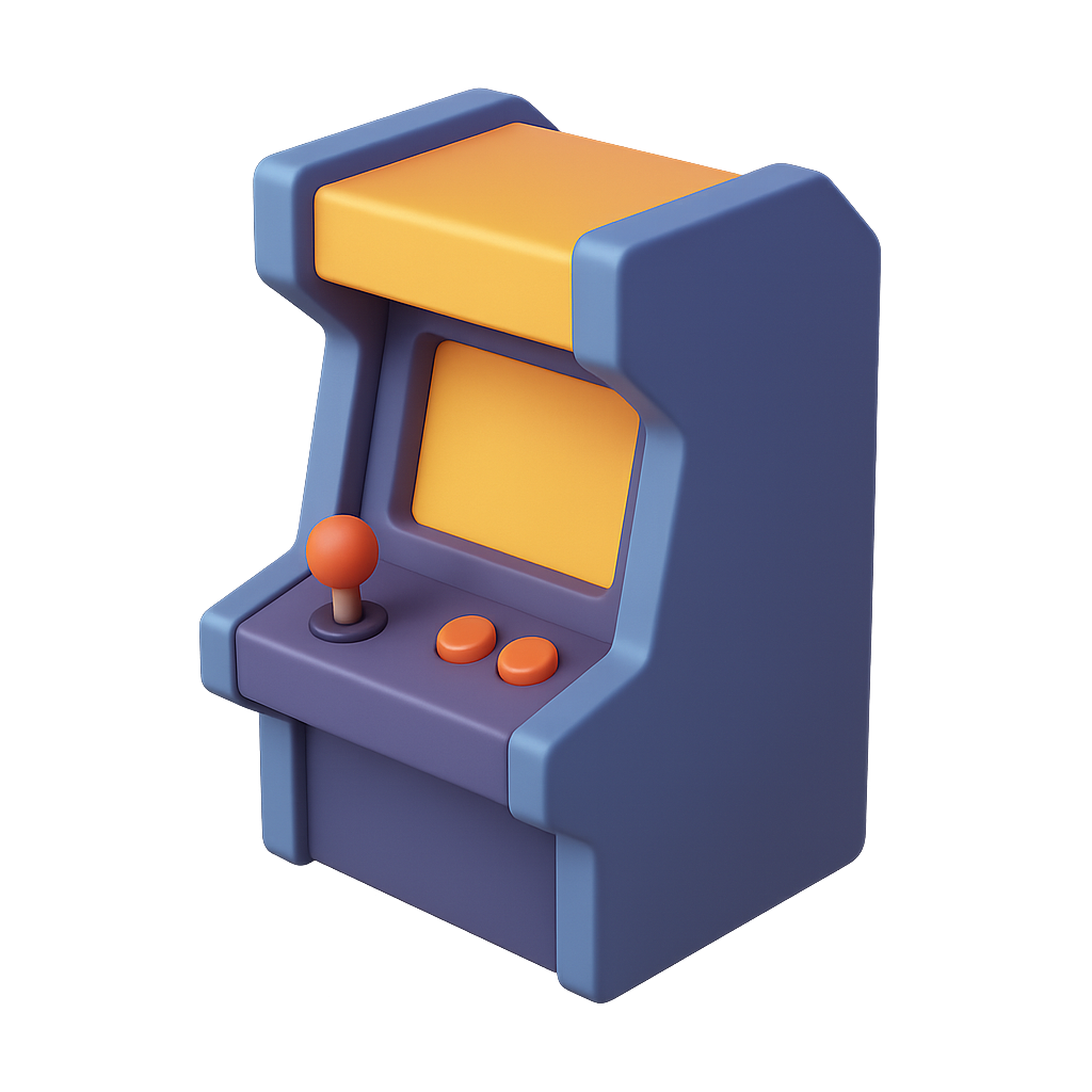 A colorful 3D arcade game icon featuring a joystick and buttons, designed in an isometric view with a transparent background, capturing a nostalgic gaming feel.