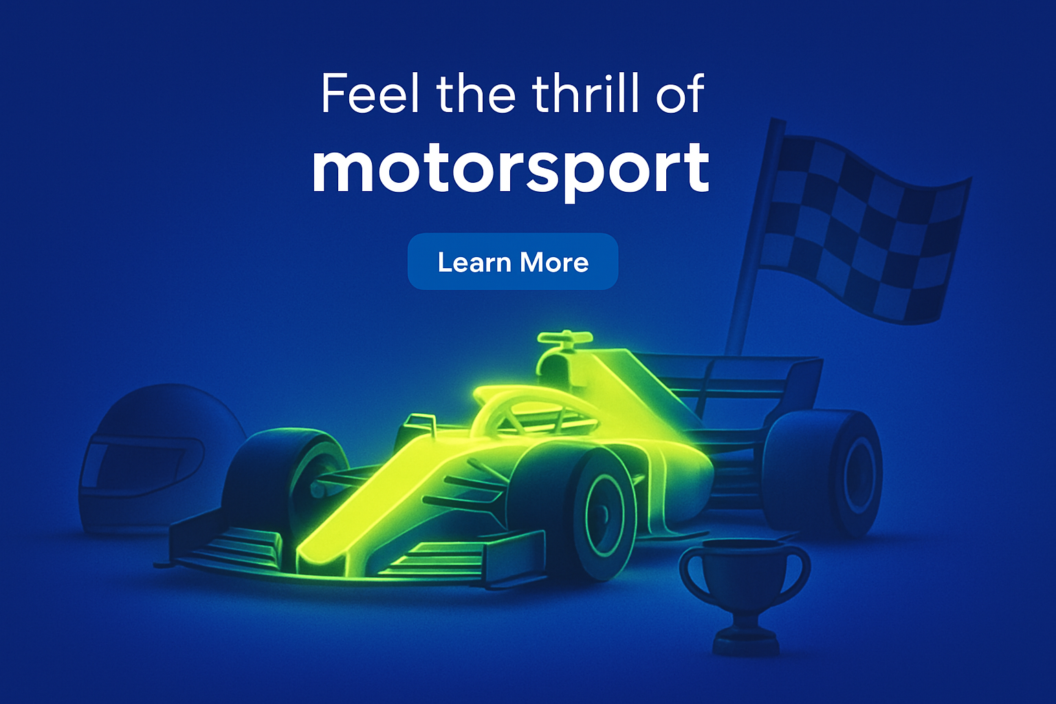 A vibrant motorsport scene featuring a glowing race car, checkered flag, helmet, and trophy. The composition is illuminated with a light yellow-green glow against a solid blue background.