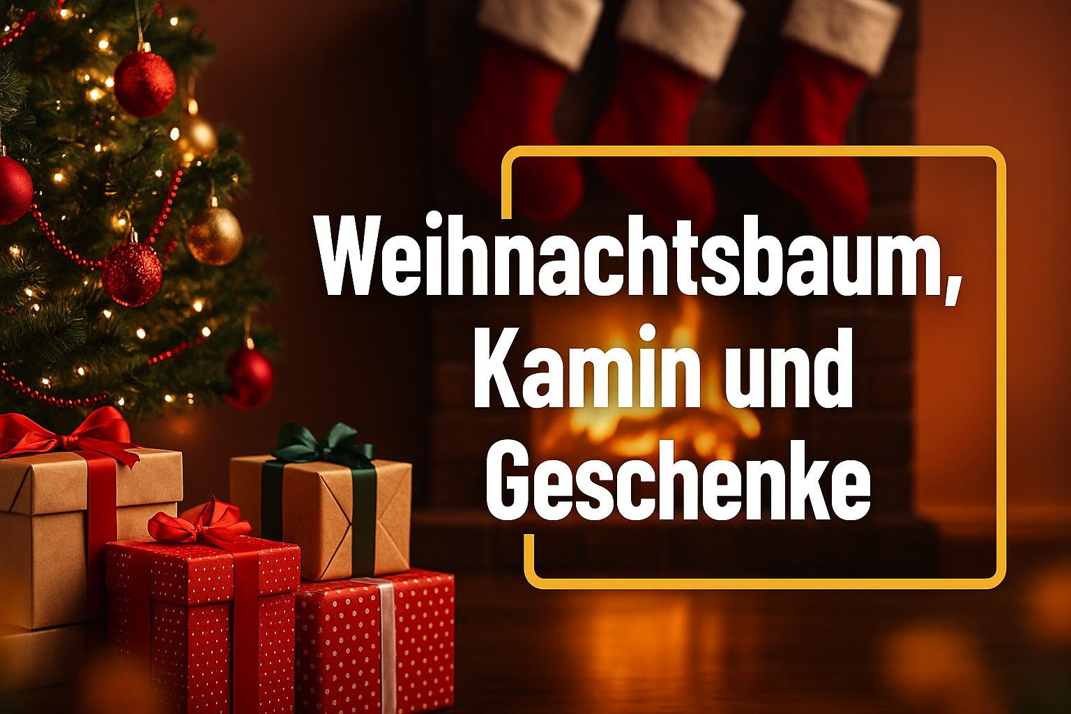A cozy Christmas setting featuring a beautifully decorated tree, a glowing fireplace with stockings, and wrapped gifts. The warm ambiance evokes holiday cheer.