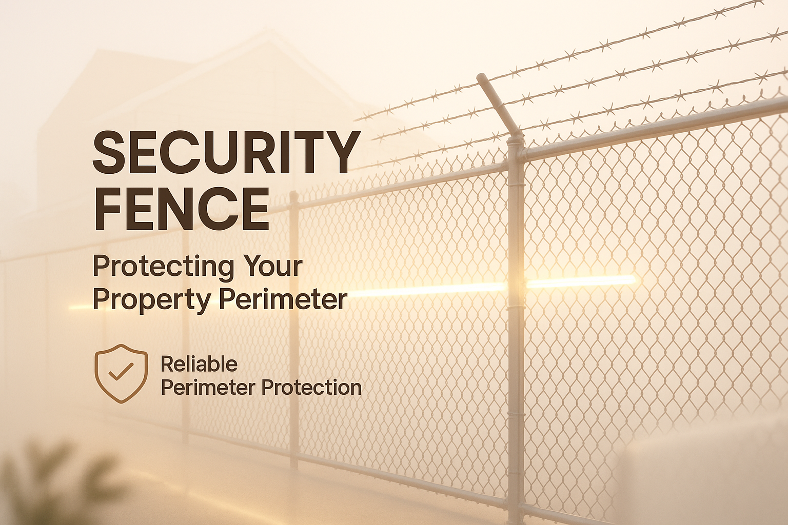 A promotional image showcasing a security fence with a modern design. Ideal for marketing property protection services, featuring a foggy backdrop for a dramatic effect.