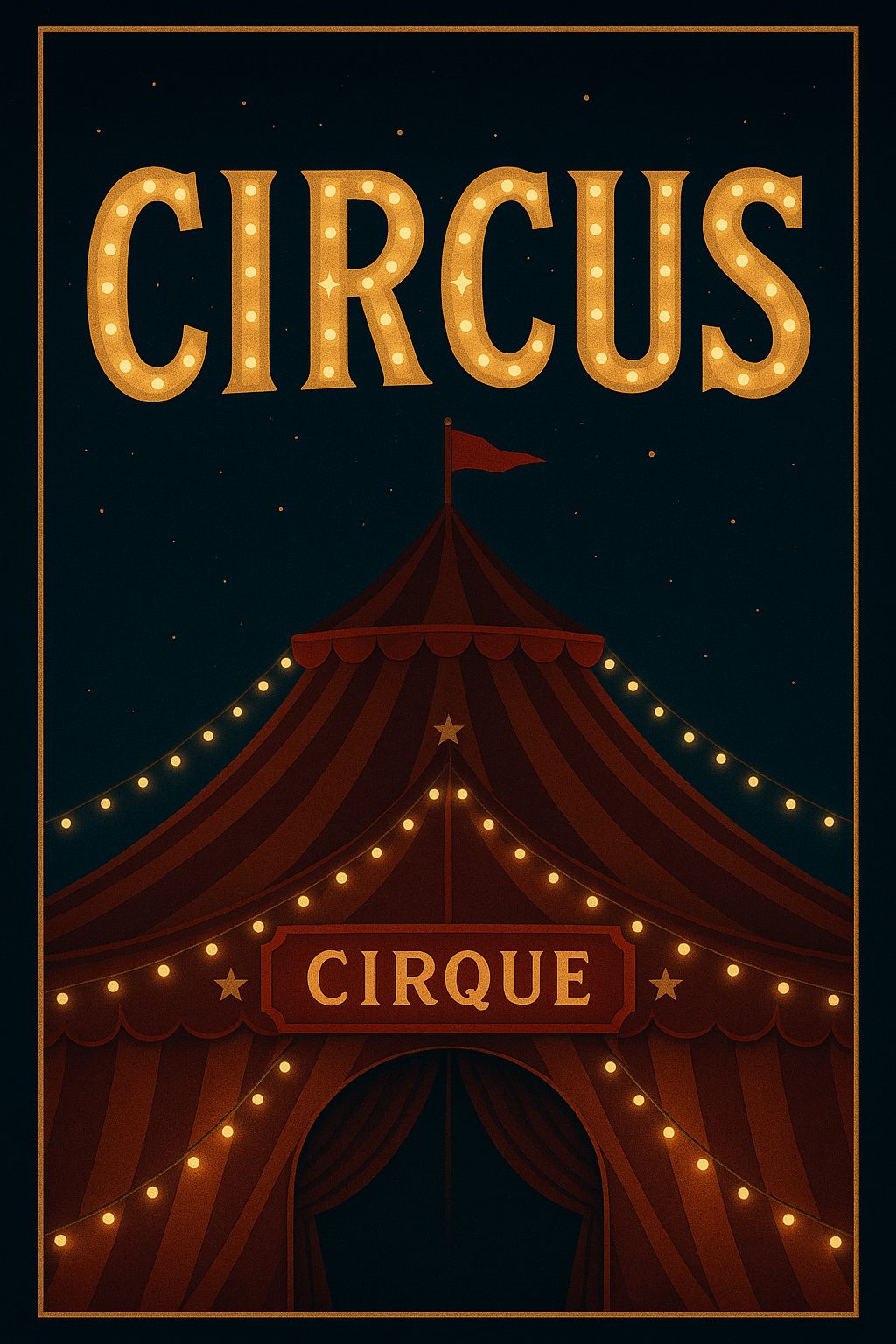 A charming illustration of a circus tent at night, featuring retro typography and warm lighting. Ideal for event promotions or themed parties.