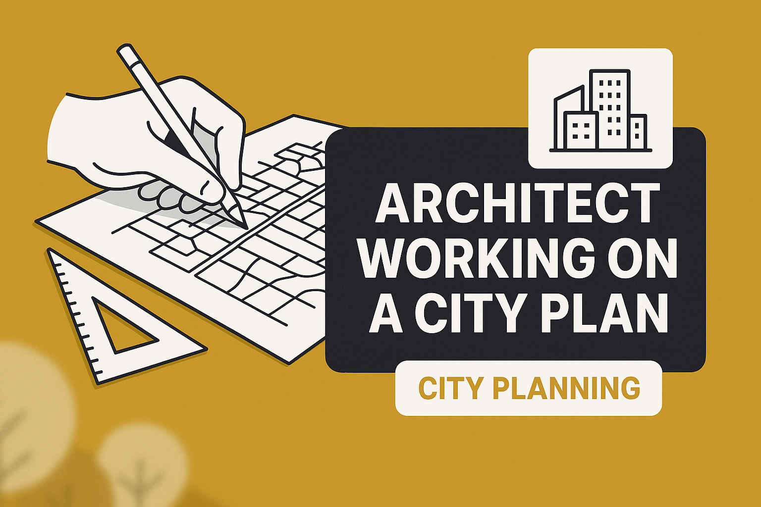 Illustrative graphic depicting an architect sketching a city plan with tools. Ideal for urban planning presentations or educational content.