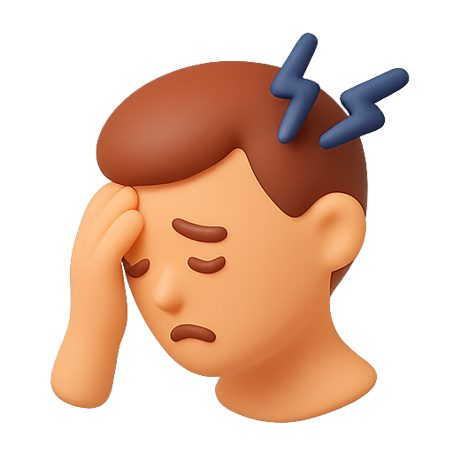 /Collection: /by davooda/Type: PNG/A stylized 3D emoji representation of a man appearing distressed, with a hand on his forehead and lightning bolts indicating pain or stress. This graphic can be used in digital communication to express feelings of frustration or anxiety.