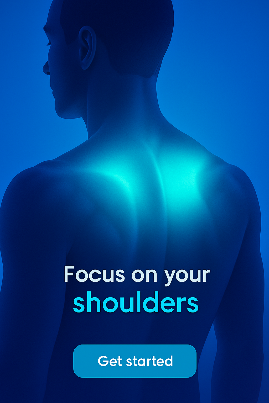 A male figure's shoulders illuminated with a vivid aquamarine glow against a solid blue background. The glow casts a cool atmosphere, emphasizing the text 'Focus on your shoulders'.