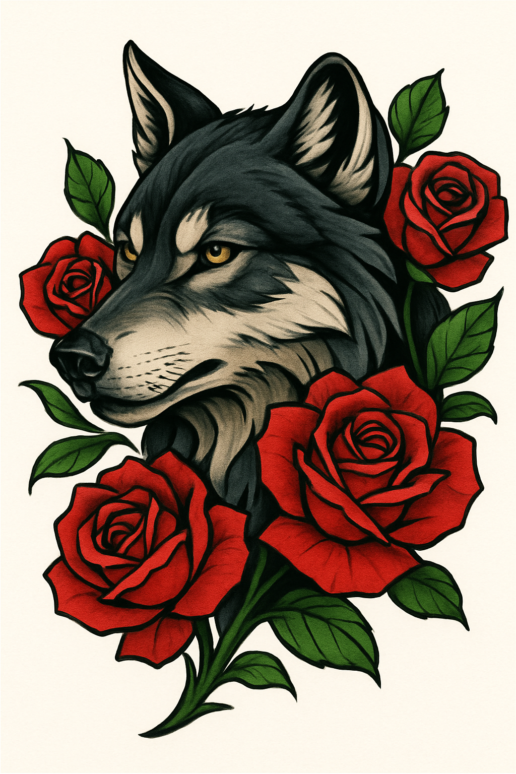 /Collection: /by davooda/Type: PNG/Vibrant tattoo-style illustration featuring a wolf's head entwined with red roses, combining natural imagery with bold colors for an artistic expression. Ideal for tattoo design inspiration or wildlife art.