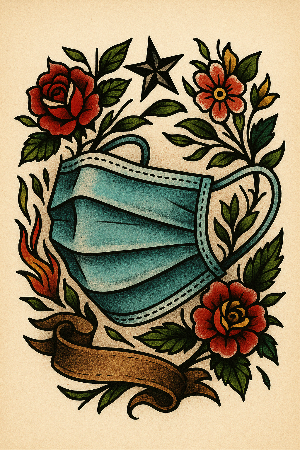 Tattoo-style illustration of a face mask with flowers