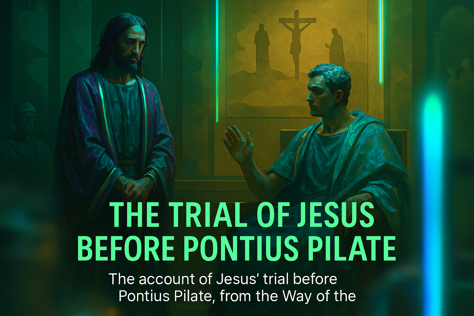 /Collection: /by davooda/Type: PNG/A captivating digital artwork depicting the trial of Jesus before Pontius Pilate, featuring dramatic lighting and historical elements, ideal for religious education or storytelling.