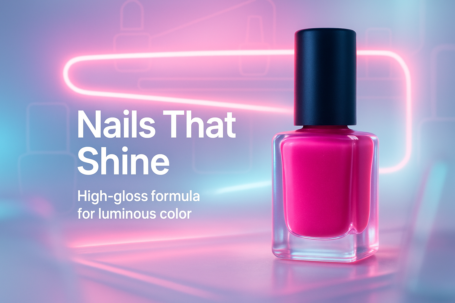 Stylish promotional image showcasing a vibrant pink nail polish bottle against a colorful neon backdrop, ideal for beauty marketing and e-commerce.