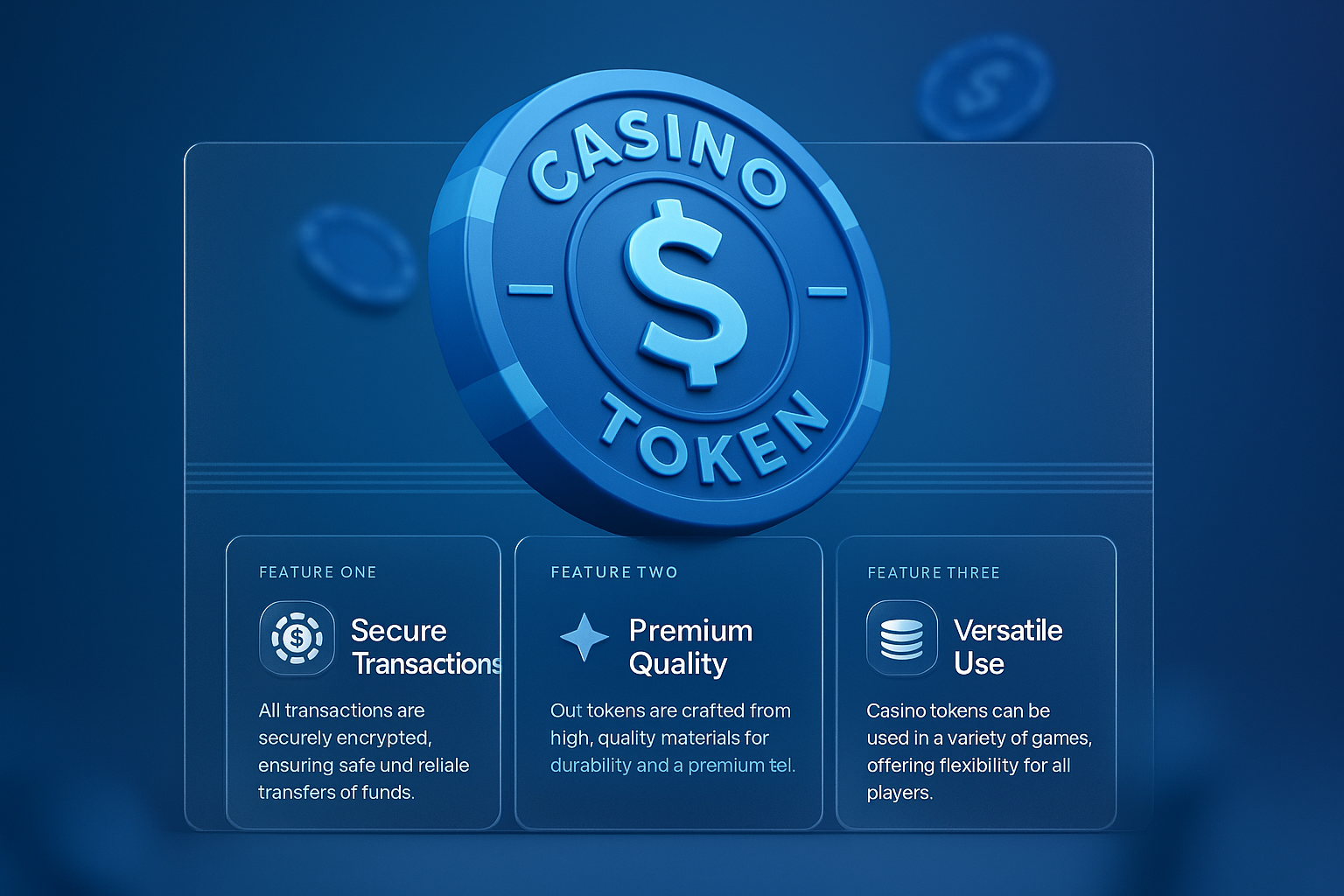 A visually striking 3D illustration of a casino token featuring three highlighted features: Secure Transactions, Premium Quality, and Versatile Use, all presented clearly with an attractive gradient background.