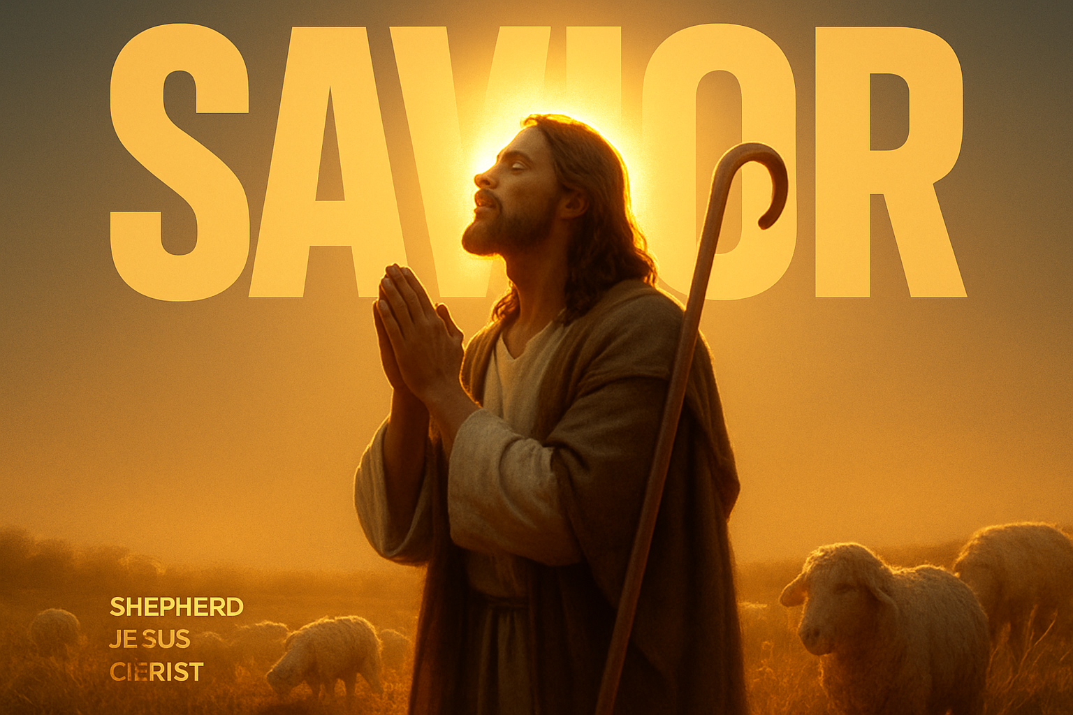 /Collection: /by davooda/Type: PNG/A powerful depiction of Jesus Christ as a shepherd, praying in a sunlit field surrounded by sheep. The image features bold typography and a dramatic layout, emphasizing the central figure.