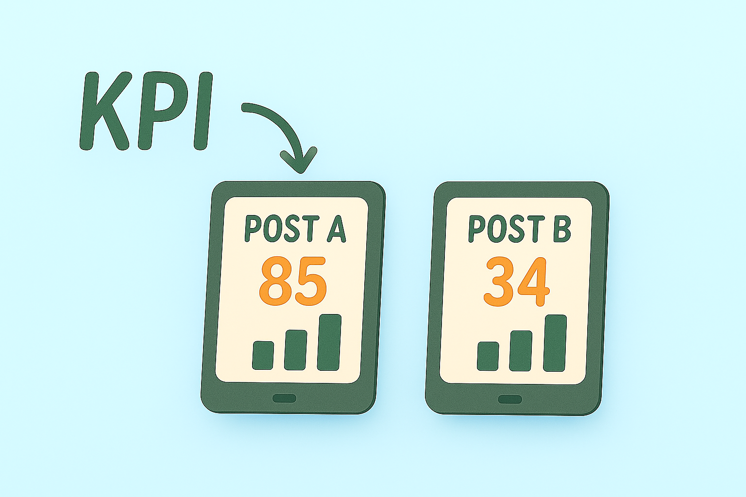 Illustrative graphic depicting a KPI comparison between two posts using smartphone visuals. Ideal for presentations or reports in marketing and analytics.