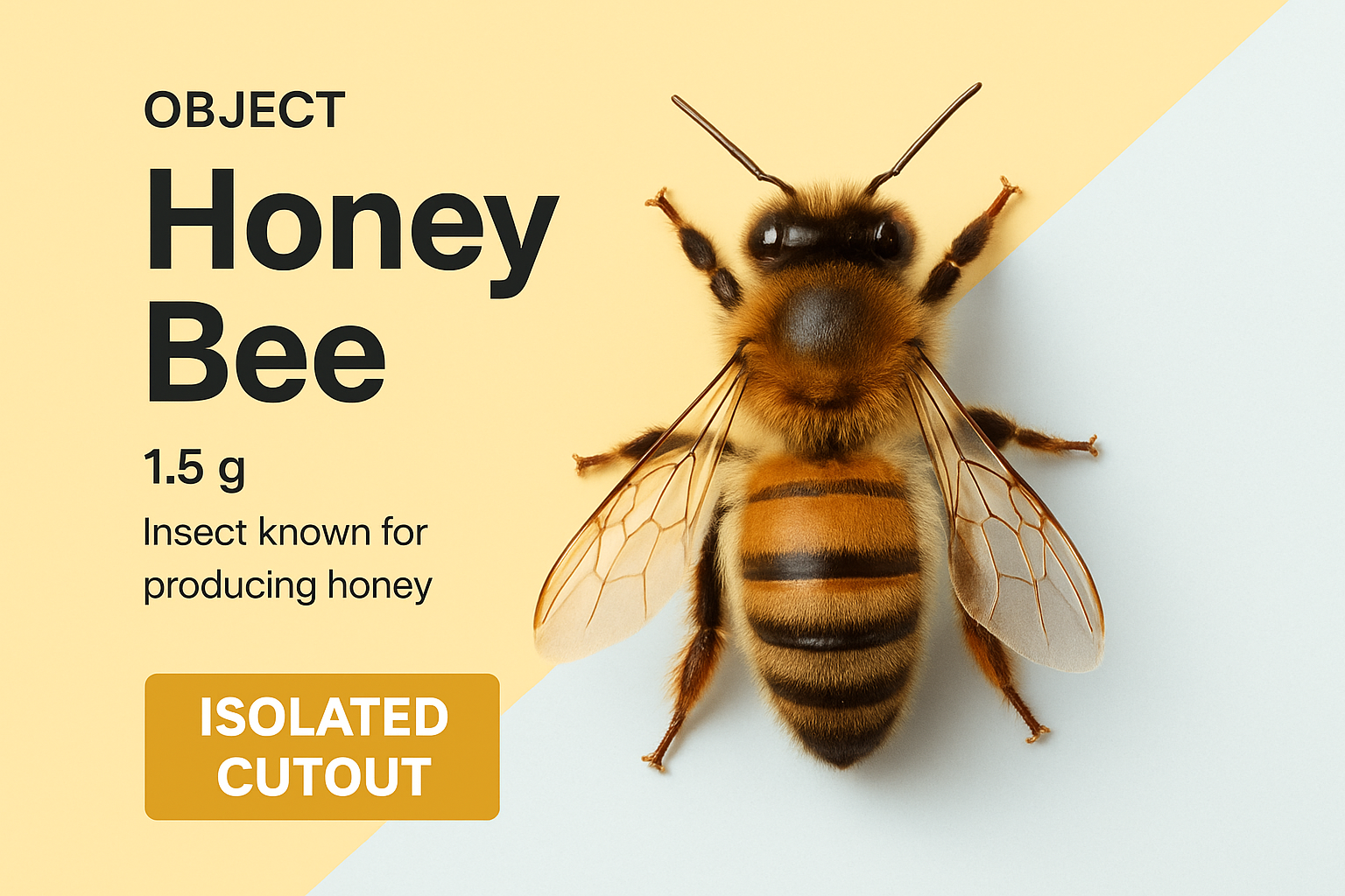 /Collection: /by davooda/Type: PNG/The image features a realistic top view of a honey bee on a divided background, showcasing a clean product advertisement style with bold typography and contrasting colors.