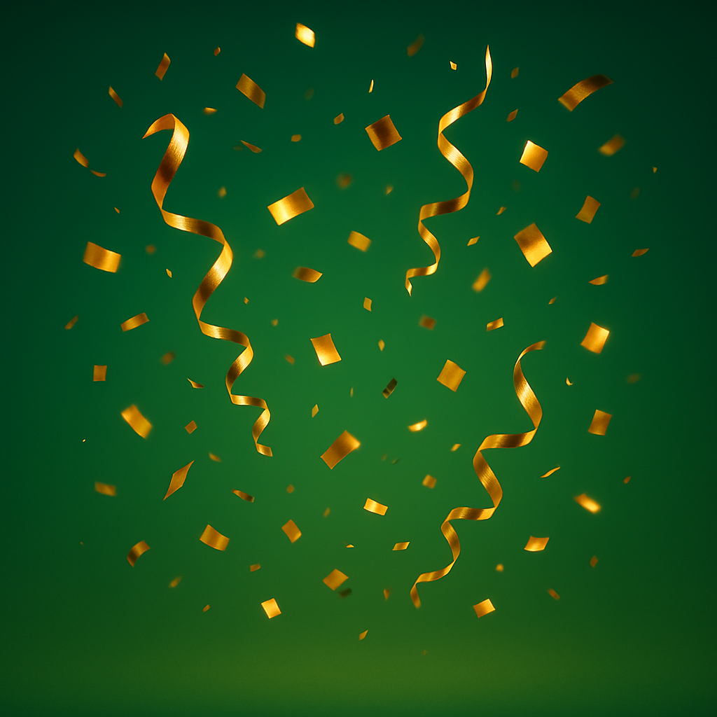 /Collection: /by davooda/Type: PNG/A stunning display of shiny gold confetti and ribbons falling against a vibrant green background. The composition highlights the celebratory theme with a layered structure and balanced aesthetics.