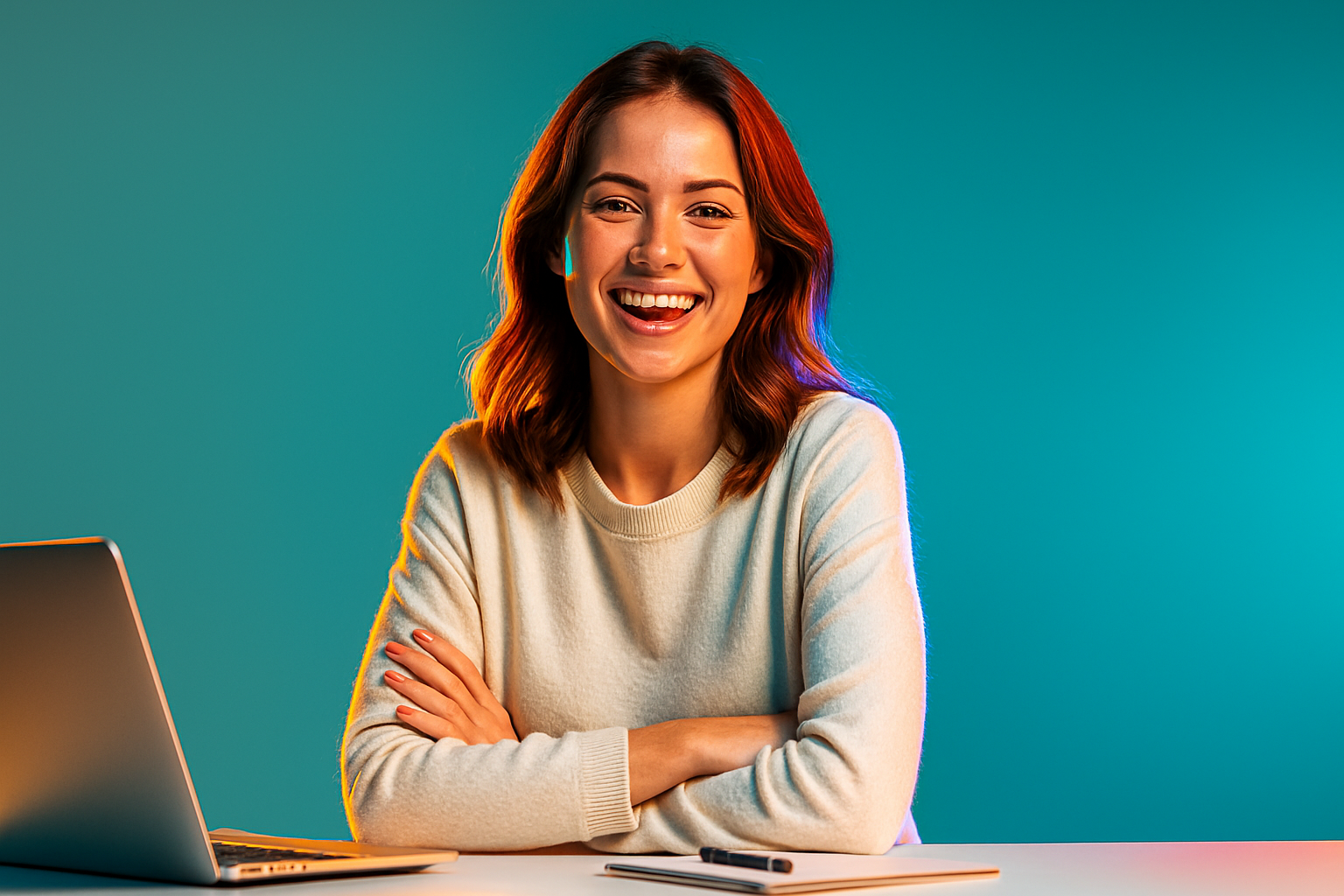 /Collection: /by davooda/Type: PNG/A beautiful woman is smiling at the camera while seated at an office desk. She is illuminated with contrasting lights and set against a vibrant, solid color background.