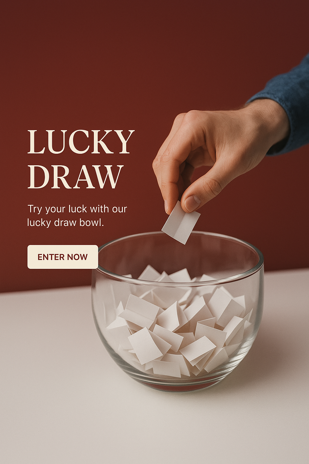 An elegant lucky draw bowl filled with white slips, highlighting a hand drawing a ticket. The design features a rich gradient background, enhancing the promotional theme.