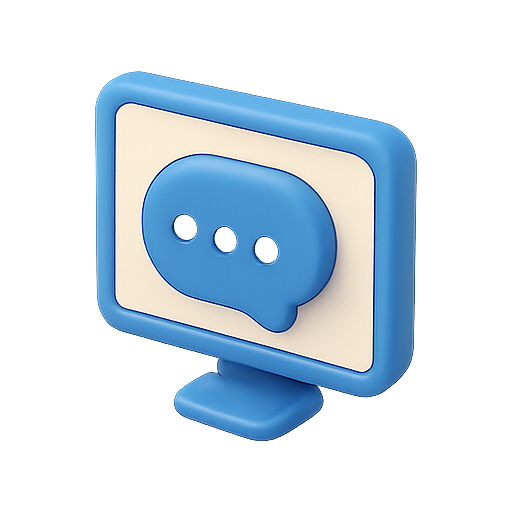 Stylized 3D icon depicting a computer monitor with a speech bubble, ideal for communication or messaging applications. Features smooth curves and a vibrant blue color.