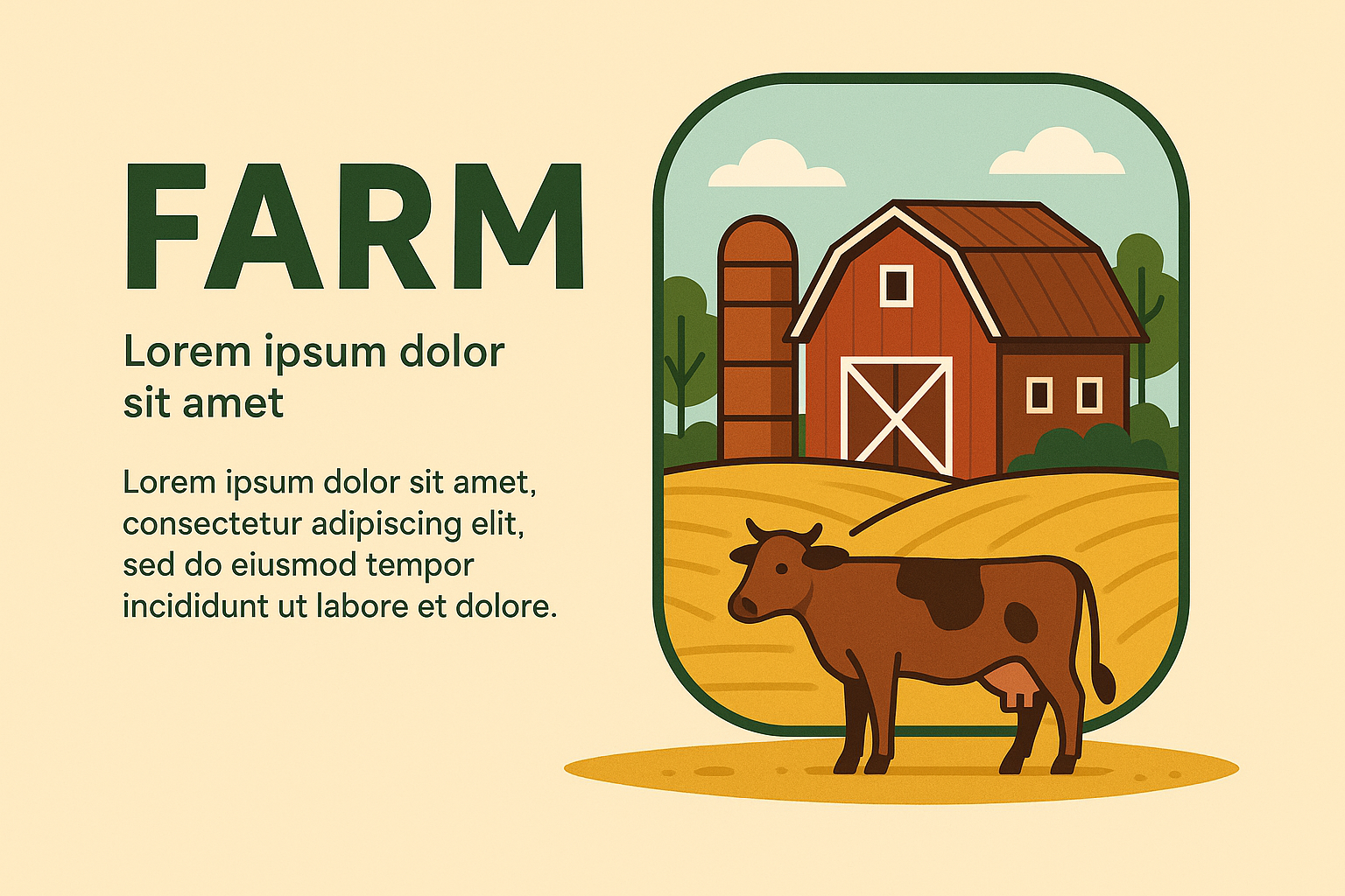 /Collection: /by davooda/Type: PNG/The image features a stylized farm scene with a barn, silo, and a cow. It employs a layered design with a gradient background, geometric shapes, and a harmonious color scheme.