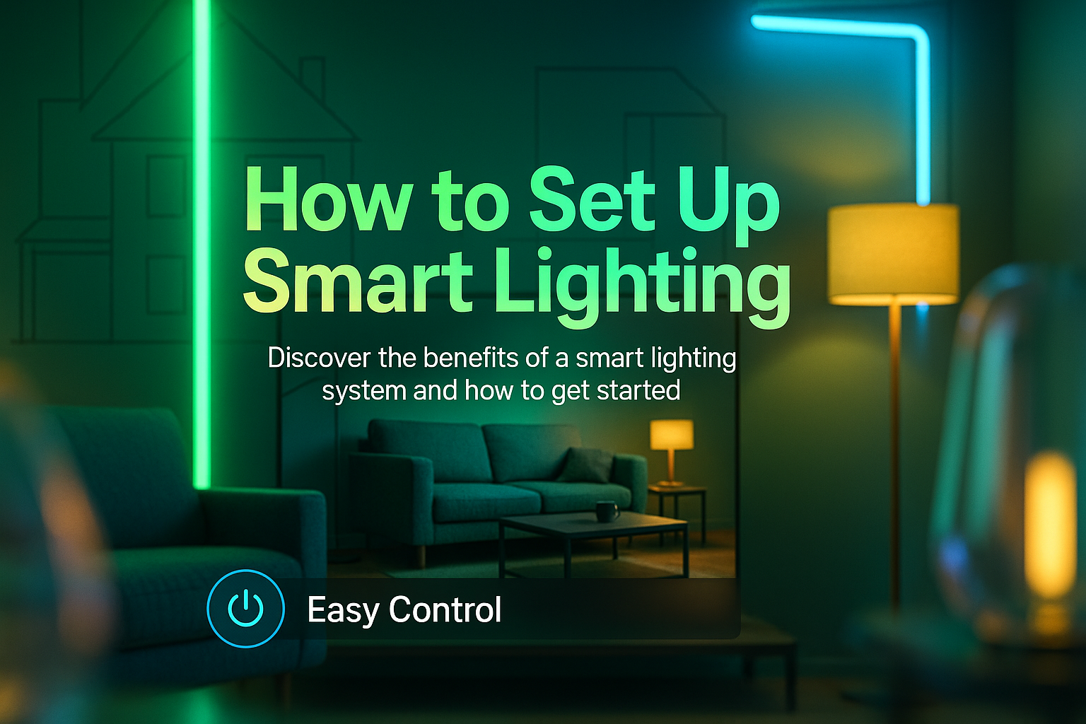 Informative graphic featuring a modern living space with smart lighting elements, aimed at educating users about smart lighting systems and their benefits.