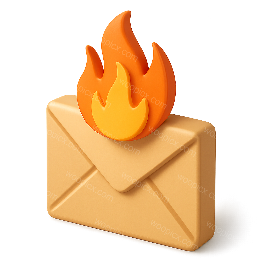 A 3D icon of an envelope with stylized flames on top, designed in a three-quarter view. The flames are vibrant orange and yellow, creating a striking visual effect.