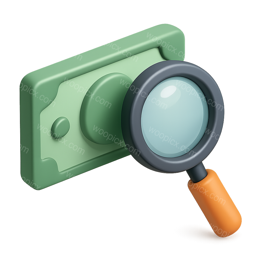 A 3D icon featuring a magnifying glass positioned over a stylized banknote. The design includes a transparent background and showcases an isometric, volumetric perspective.
