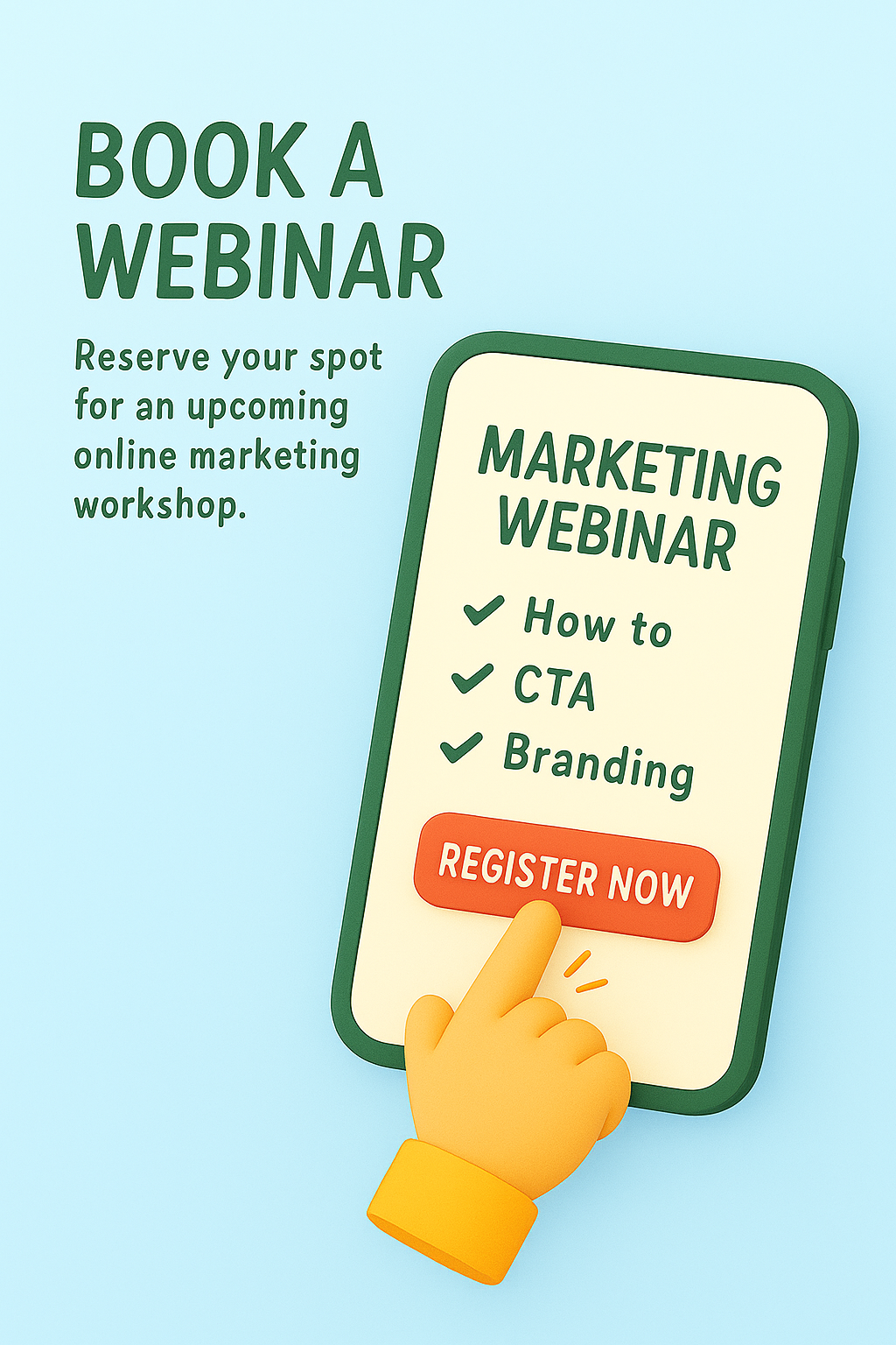 Vibrant promotional graphic encouraging registration for an online marketing webinar, featuring a smartphone design and engaging call-to-action elements.