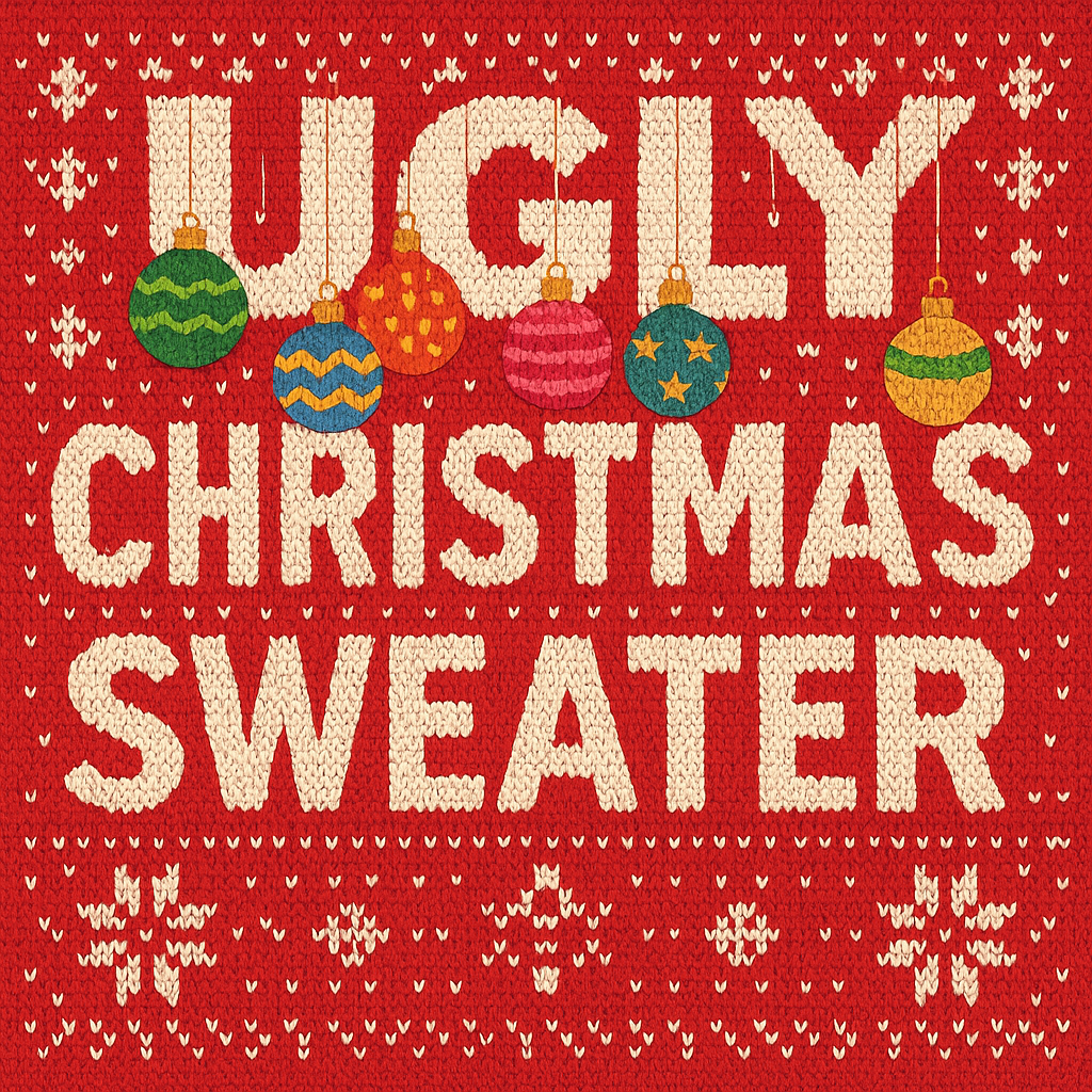 /Collection: /by davooda/Type: PNG/Vibrant Christmas-themed graphic featuring the phrase 'Ugly Christmas Sweater' adorned with colorful ornaments, ideal for holiday-themed marketing or merchandise.