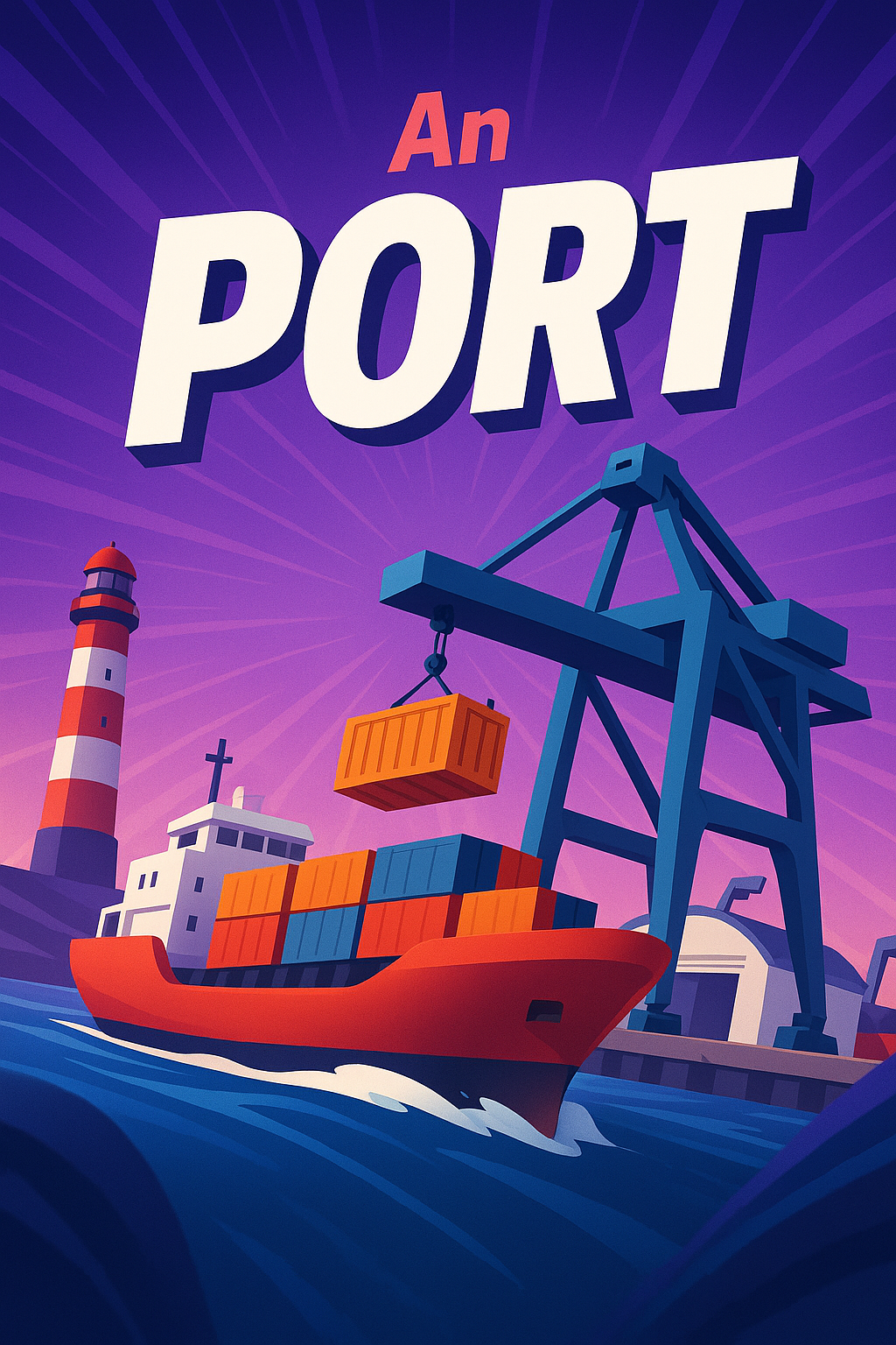 /Collection: /by davooda/Type: PNG/A dynamic and colorful illustration showcasing a port scene. A container ship is prominently displayed with a crane unloading cargo, complemented by a lighthouse in the background. The bold title 'An PORT' stands out against a vibrant gradient sky.