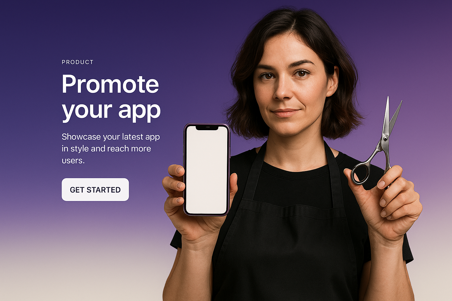 /Collection: /by davooda/Type: PNG/A stylish hairdresser is holding a purple phone in one hand and scissors in the other. The background features a gradient from dark to white, emphasizing the professional vibe.