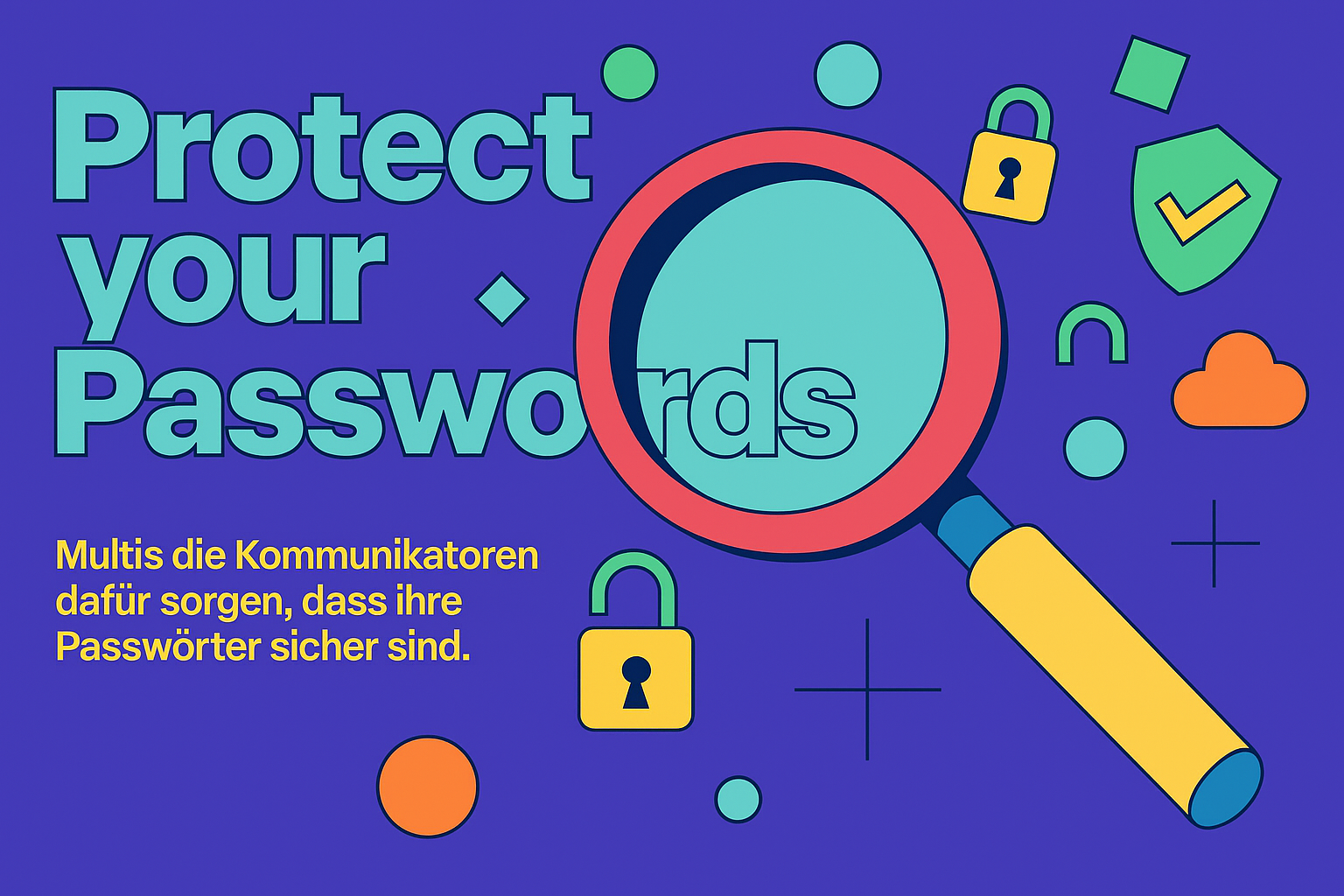 /Collection: /by davooda/Type: PNG/A vibrant vector illustration featuring a realistic magnifying glass surrounded by colorful icons. The background is dynamic, enhancing the main subject with bold typography conveying a security message.