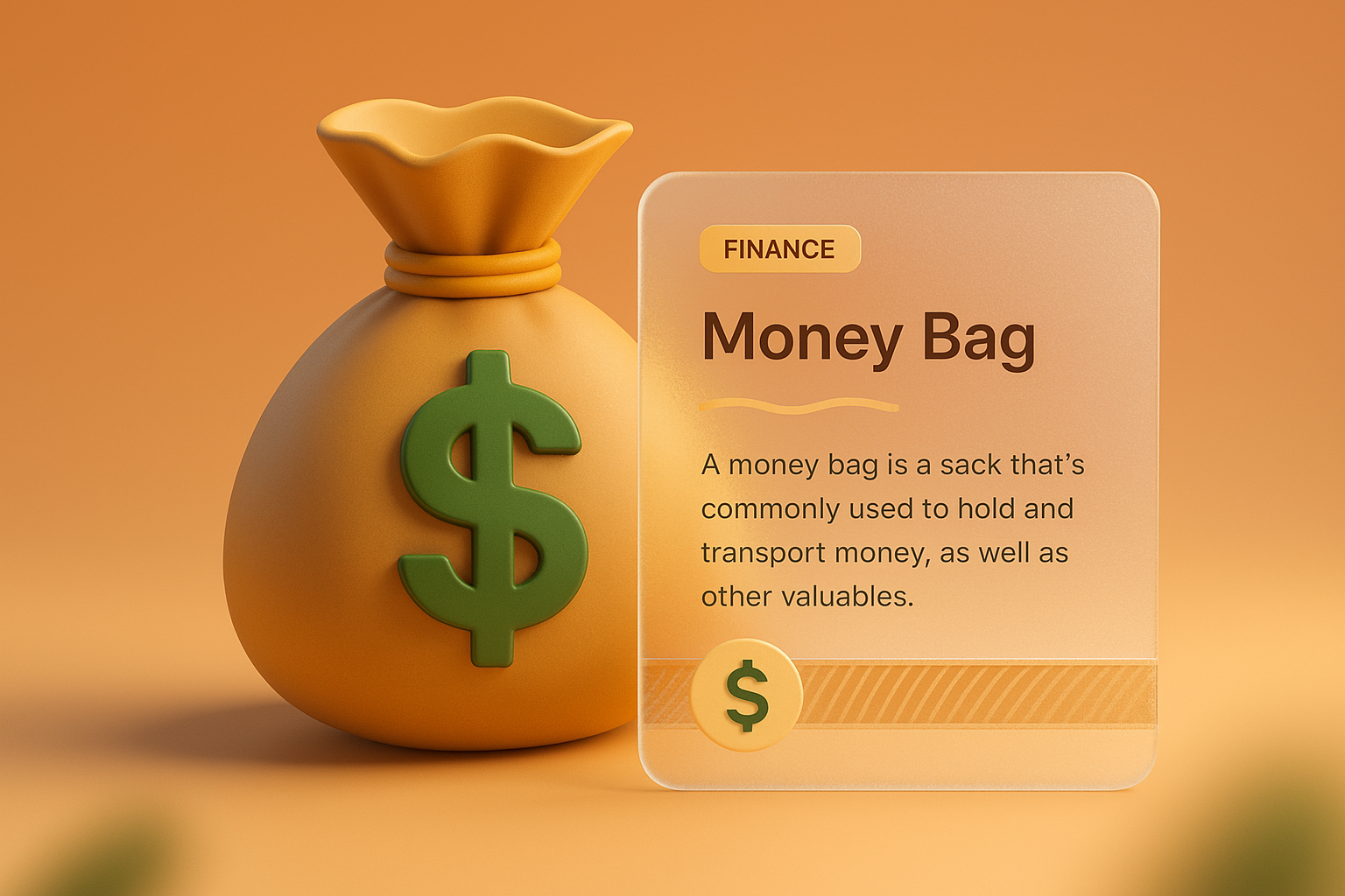A vibrant 3D illustration of a money bag featuring a dollar sign, accompanied by a transparent label that defines its purpose. The background transitions smoothly with warm colors.