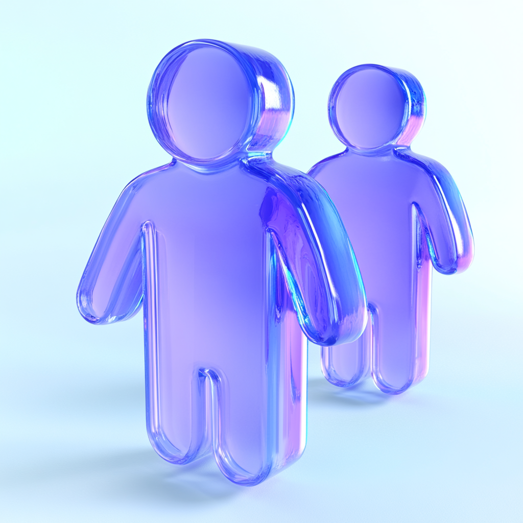 A pair of glossy, translucent human figures in a soft gradient of purple and blue, ideal for digital art or graphic design projects emphasizing modern aesthetics.