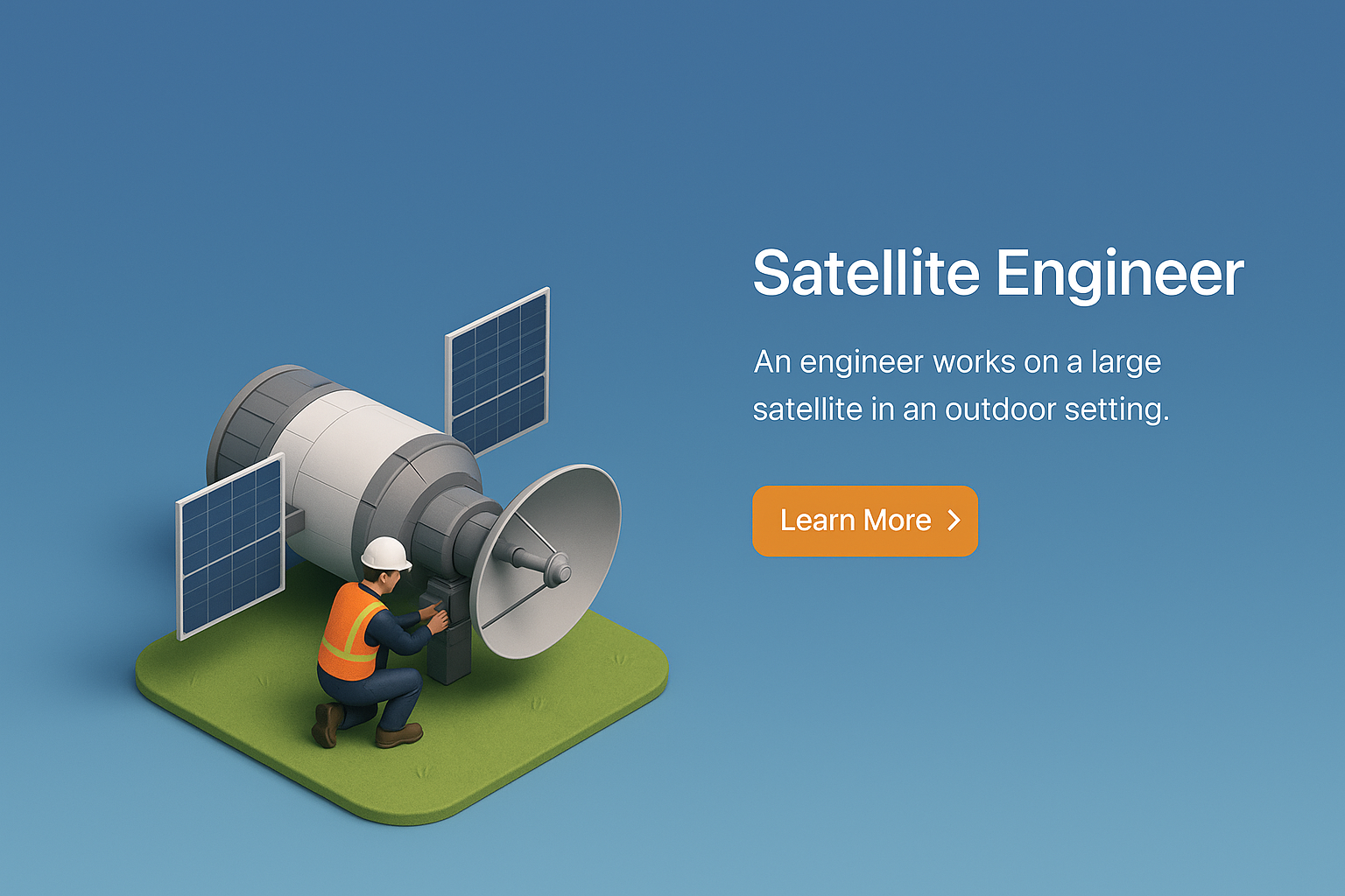A 3D illustration depicting a satellite engineer working on a large satellite outdoors. The scene is zoomed out, showing the engineer and satellite in a minimalistic environment with a smooth gradient background.