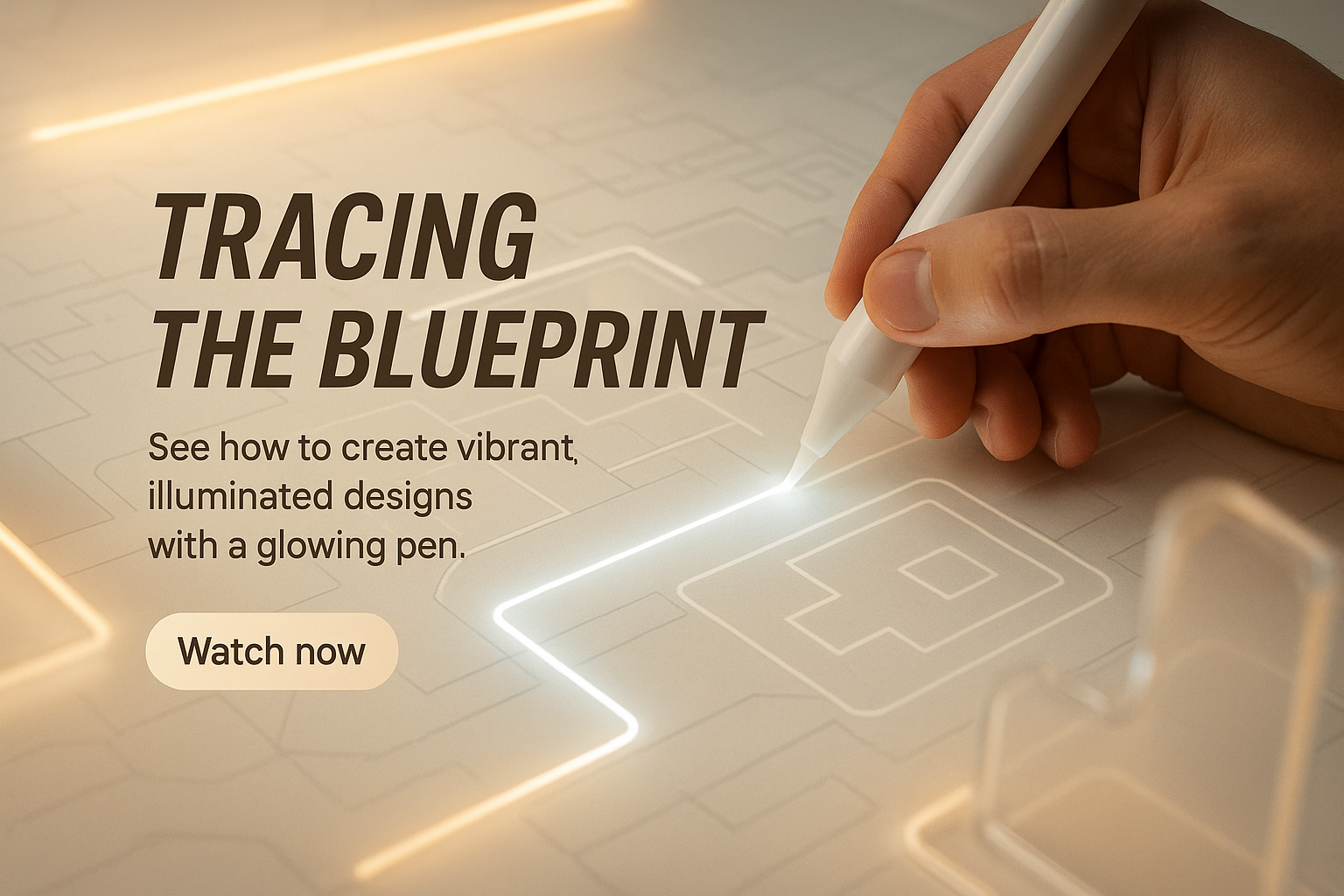 Engaging promotional graphic for a digital design tutorial, featuring a hand holding a pen creating illuminated designs on a blueprint-like background. Ideal for online courses or video content.