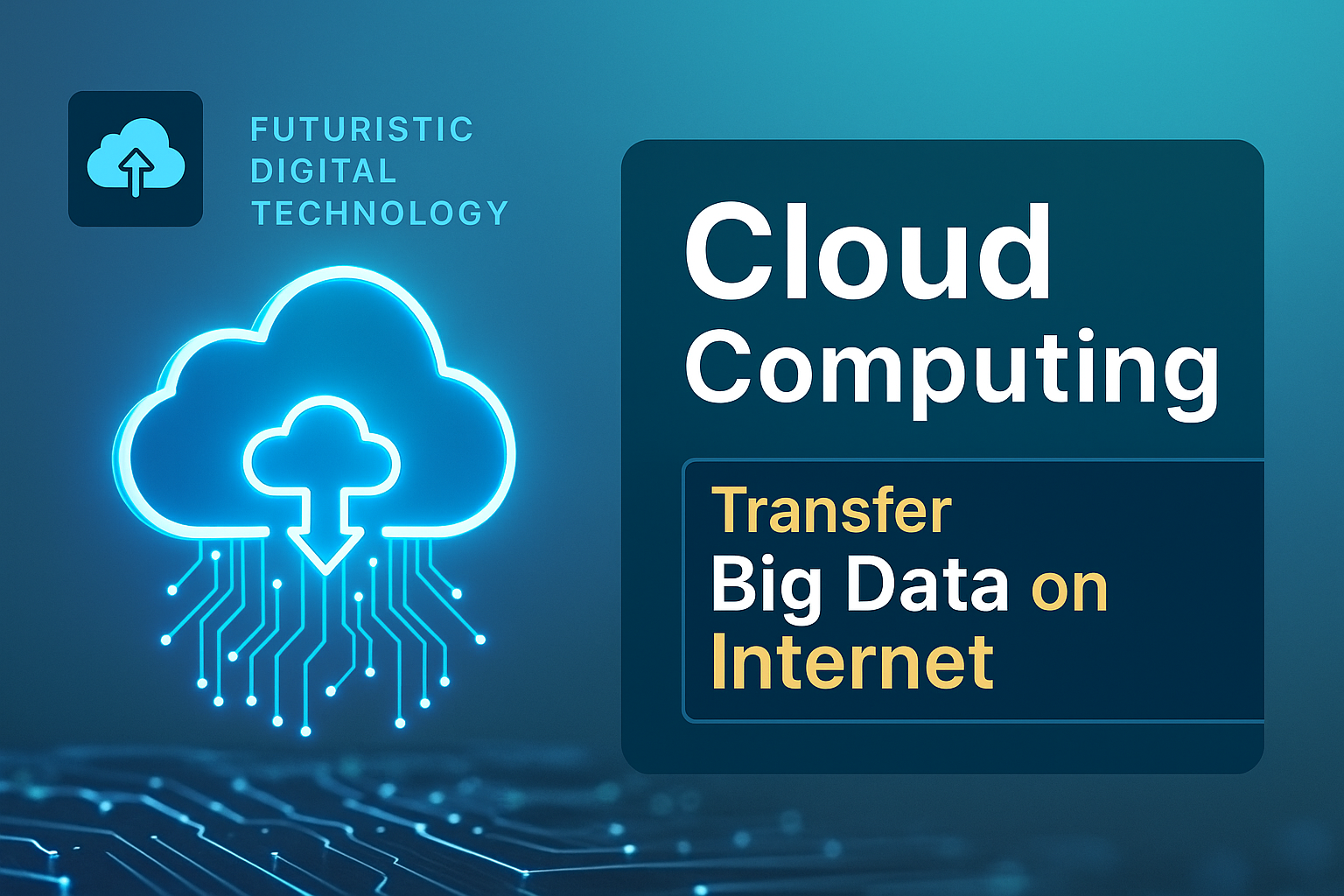 A visually striking depiction of cloud computing showcasing big data transfer over the internet. The design features glowing cloud graphics and network elements with a professional aesthetic.