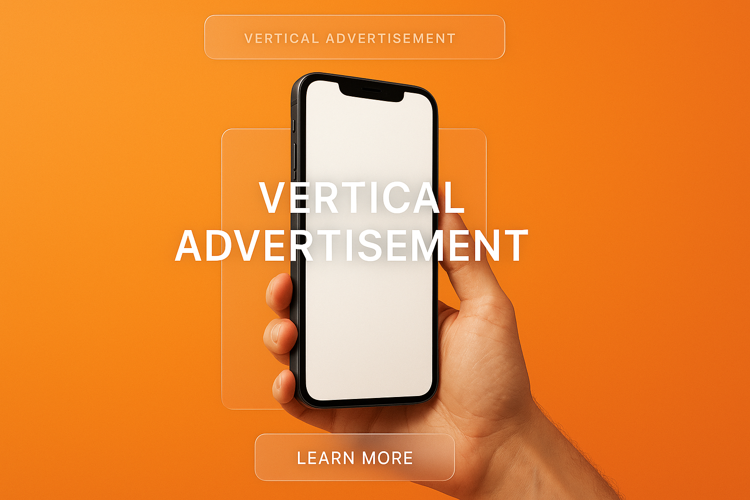 /Collection: /by davooda/Type: PNG/A modern vertical advertisement featuring a smartphone held in hand against a vibrant orange background. Layered glass panels display bold text and a call-to-action.