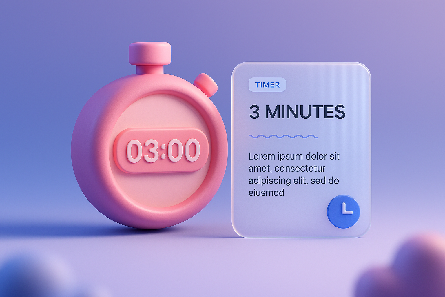 /Collection: /by davooda/Type: PNG/A visually appealing 3D illustration featuring a pink timer set to three minutes, accompanied by a clean information block with text and a label. The background transitions smoothly from gradient to solid color, enhancing the overall aesthetic.