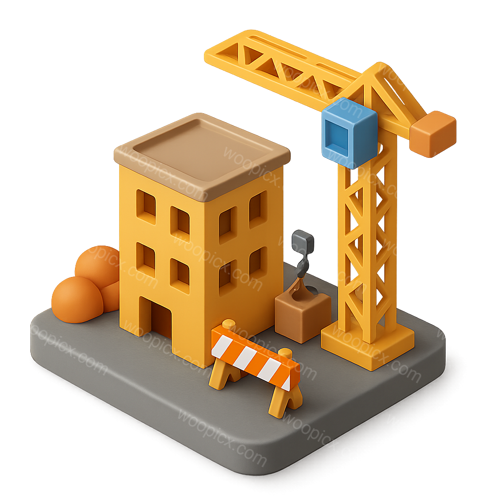 /Premium/Collection: /by davooda/Type: PNG/A colorful 3D icon depicting a building site featuring a yellow crane, a multi-story building, construction barriers, and construction materials. The design has a transparent background and an isometric perspective, enhancing its volumetric appearance.