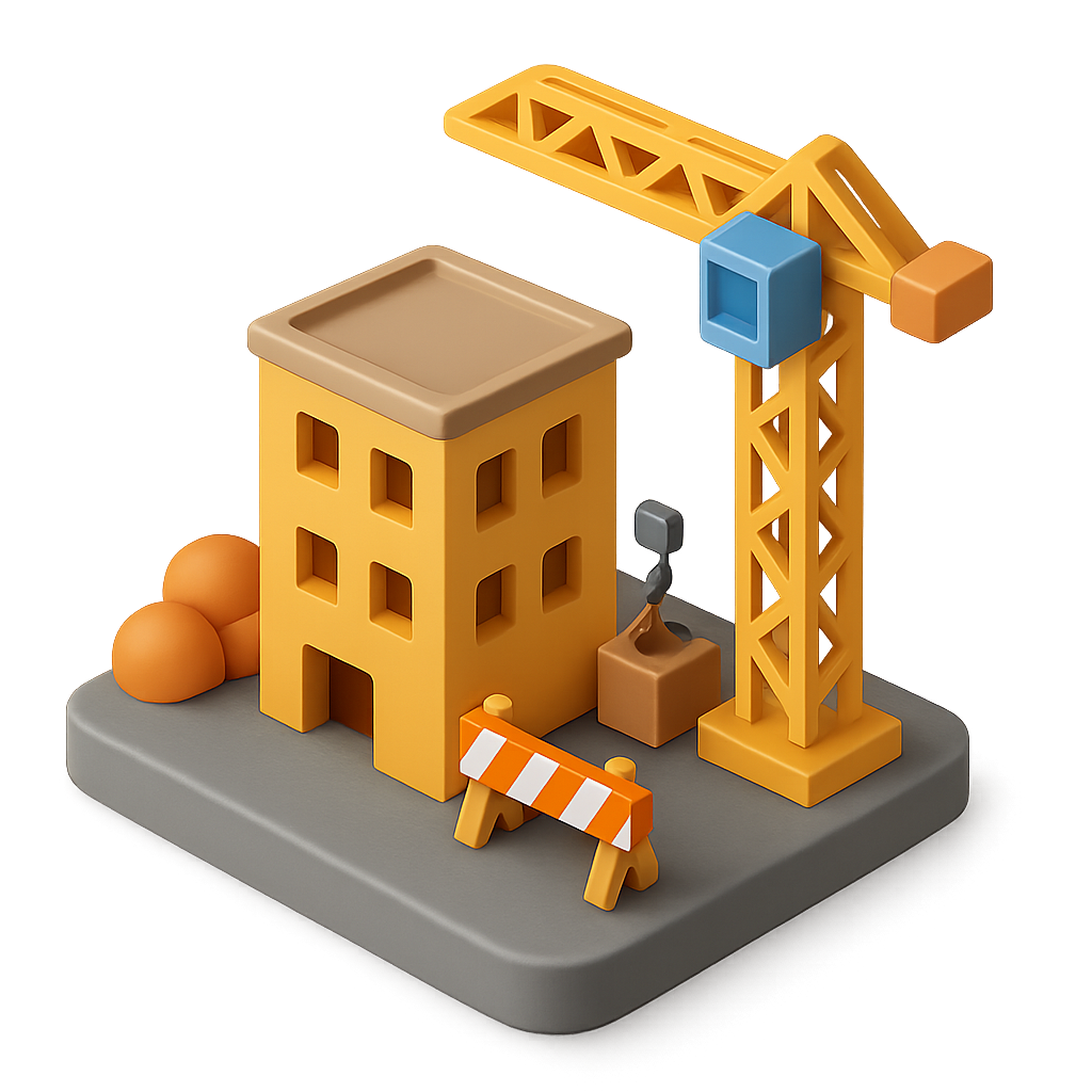 /Collection: /by davooda/Type: PNG/A colorful 3D icon depicting a building site featuring a yellow crane, a multi-story building, construction barriers, and construction materials. The design has a transparent background and an isometric perspective, enhancing its volumetric appearance.